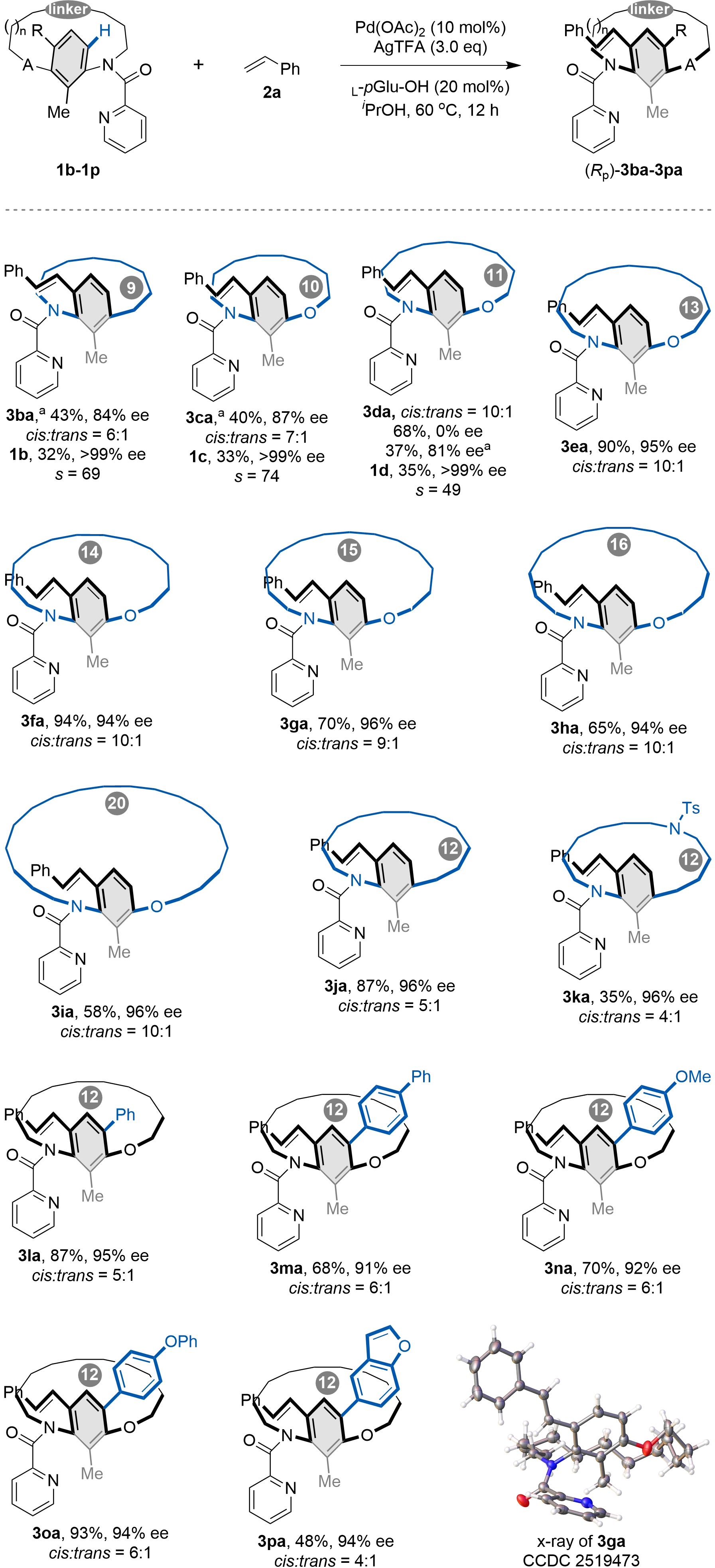 We next examined the effect of ansa chain length and benzene ring substituents on the reaction (Scheme 3). For [9]-[11]metacyclophanes, the C–H olefination proceeded via a kinetic resolution pathway. Under standard conditions, using 2.0 equivalents of alkene 2a, [11]metacyclophane 3da was obtained in 68% yield with 0% ee, as both isomers were fully consumed. When the loading of 2a was reduced to 0.5 equivalents, product 3da was obtained in 37% yield with 81% ee, while the remaining starting material 1d was recovered in 35% yield and > 99% ee. A similar trend was observed for the [9]-[10]metacyclophanes (3ba–3ca), which also exhibited high selectivity under kinetic resolution conditions. In contrast, the longer-chain [13]-[16]- and [20]metacyclophanes underwent dynamic kinetic resolution, furnishing the corresponding products (3ea–3ia) in moderate to high yields with high enantioselectivities. Furthermore, [12]metacyclophane comprising heteroatom variations in the ansa chain were obtained in good yields with high enantioselectivity (3ka). More importantly, the reaction demonstrated broad tolerance for diverse aromatic substituents at the 2-position of the benzene ring, affording products 3la–3pa in synthetically useful yields and with high enantioselectivities.