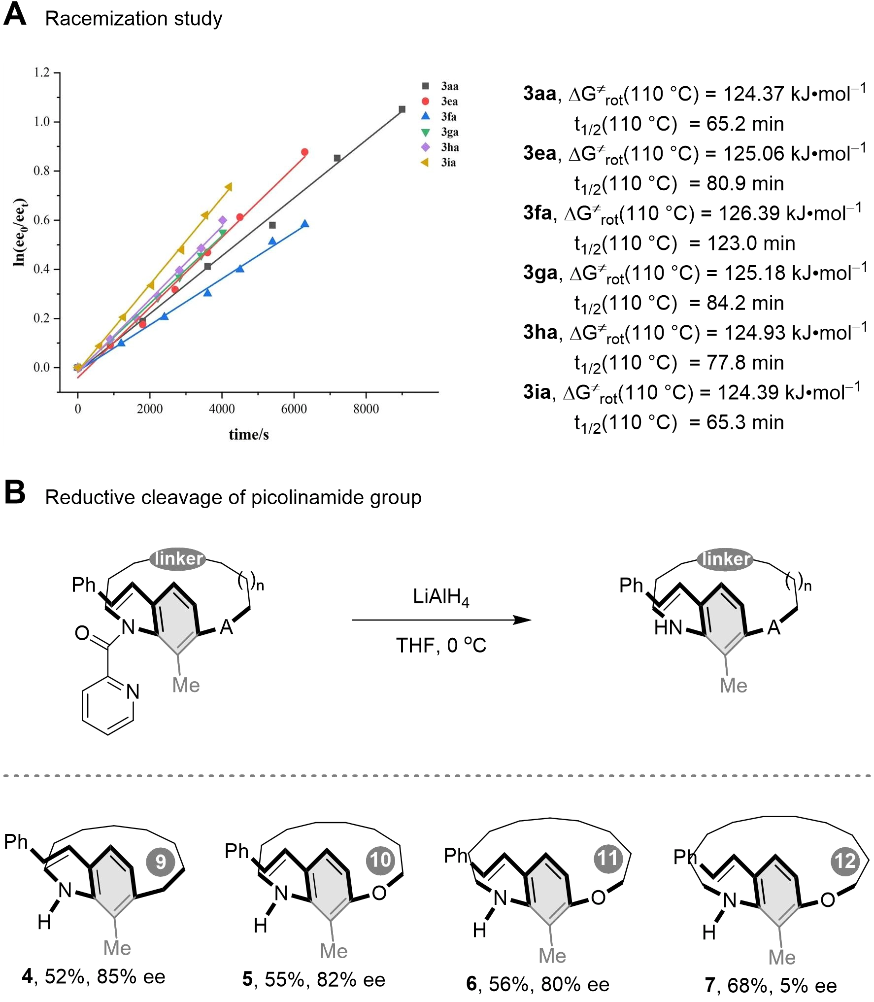 To further investigate the conformational stability of [n]metacyclophanes, racemization experiments were conducted on derivatives with varying ansa chain lengths (Scheme 4A). The results demonstrate that as the number of atoms in the ansa chain increased from 12 to 14 (3aa, 3ea to 3fa), the racemization energy barrier gradually rose. Additionally, the barriers for compounds 3ga, 3ha, and 3ia were determined to be 125.18, 124.93, and 124.39 kJ·mol-1, respectively. These observations contrast with the previously established trend[41,42,68], which suggested that increasing the length of the ansa chain reduces steric hindrance to aromatic ring rotation and thereby lowers conformational stability. Furthermore, the introduction of a picolinamide group onto the ansa chain enables concurrent rotation of the aromatic ring about both the ansa chain and the C–N axis. The overall conformational stability is governed by the combined steric hindrance arising from these two rotational modes.