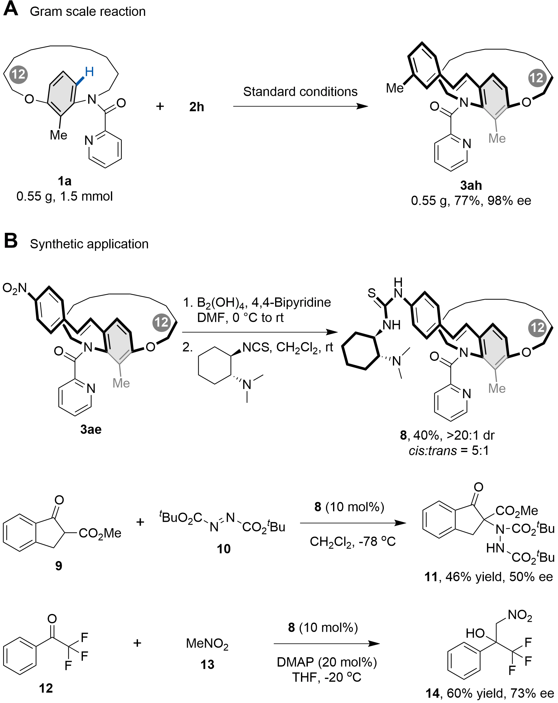 To further demonstrate the synthetic utility of this methodology, a gram-scale reaction of 1a with 2h was carried out (Scheme 5). The C–H olefination proceeded smoothly under the standard conditions, affording 0.55 g of metacyclophane 3ah in 98% ee. Subsequently, compound 3ae was transformed into a thiourea-based bifunctional catalyst. The resulting catalyst 8 was employed in the Michael addition of β-ketoester 9 to di-tert-butyl azodicarboxylate 10, furnishing product 11 in 46% yield and 50% ee. Additionally, catalyst 8 proved effective in catalyzing the Henry reaction between trifluoromethyl acetophenone 12 and nitromethane 13, affording the centrally chiral product 14 in 60% yield with 73% ee.