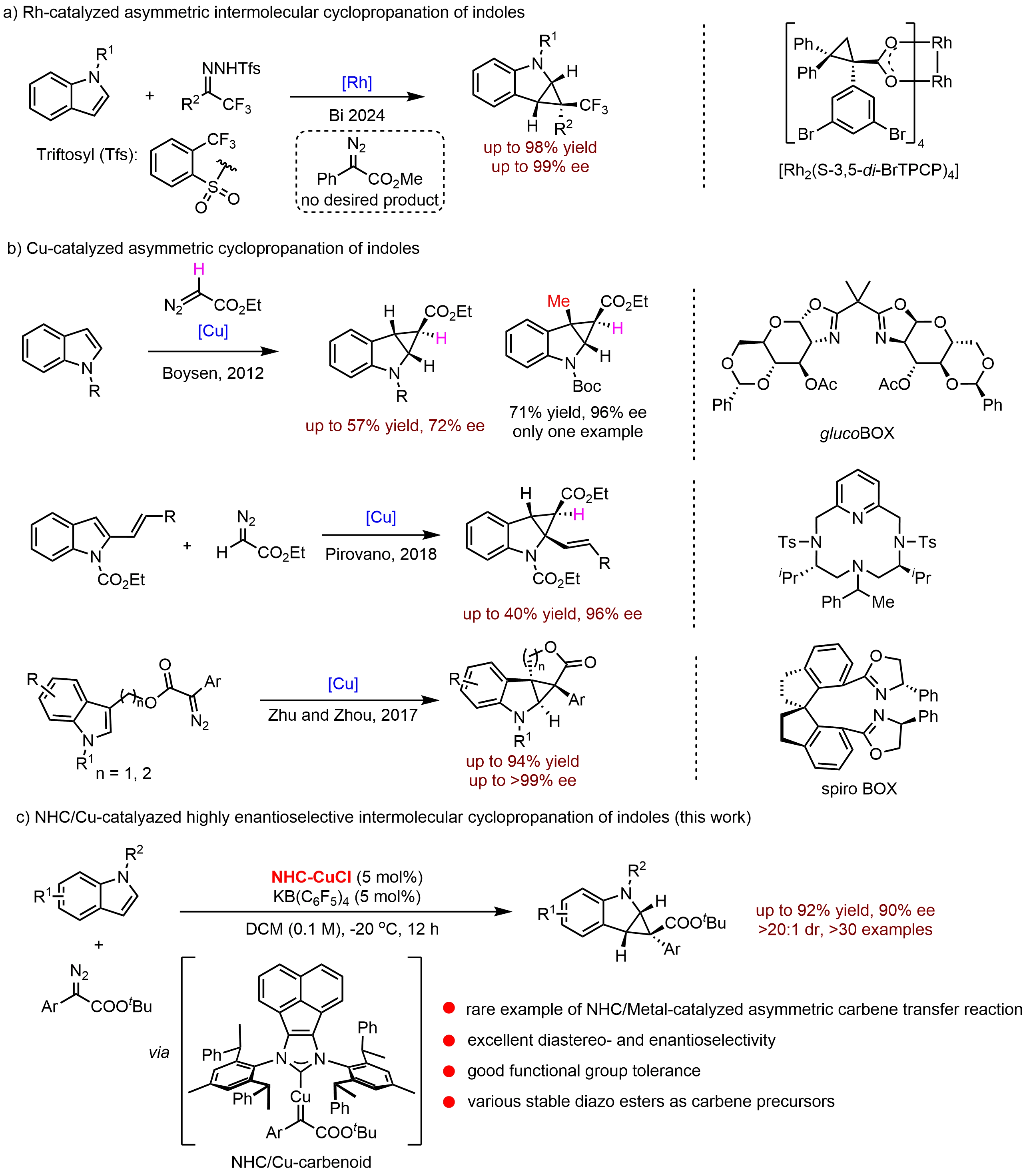 In recent years, our group has developed a series of chiral N-heterocyclic carbene (NHC) ligands[33-37]. Characterized by their strong σ-donor ability and bulky, flexible steric profiles, these ligands have consistently delivered high catalytic efficiency and outstanding stereoselectivity across a diverse array of asymmetric transformations[38-45]. Motivated by these findings, we hypothesized that an NHC/Cu catalyst system could effectively facilitate asymmetric carbene transfer. Furthermore, we postulated that the deep chiral pocket created by our NHC ligand might address the challenging stereocontrol associated with the quasi-linear NHC/Cu(I)–carbenoid intermediate[46-49]. To the best of our knowledge, enantioselective carbene transfer reactions enabled by chiral NHC/metal catalysis have not been reported[49-53]. Herein, we report a rare example of enantioselective NHC/Cu-catalyzed intermolecular cyclopropanation of indoles with diazo esters (Figure 1c). This protocol provides efficient access to cyclopropane-fused indolines with broad functional group tolerance.