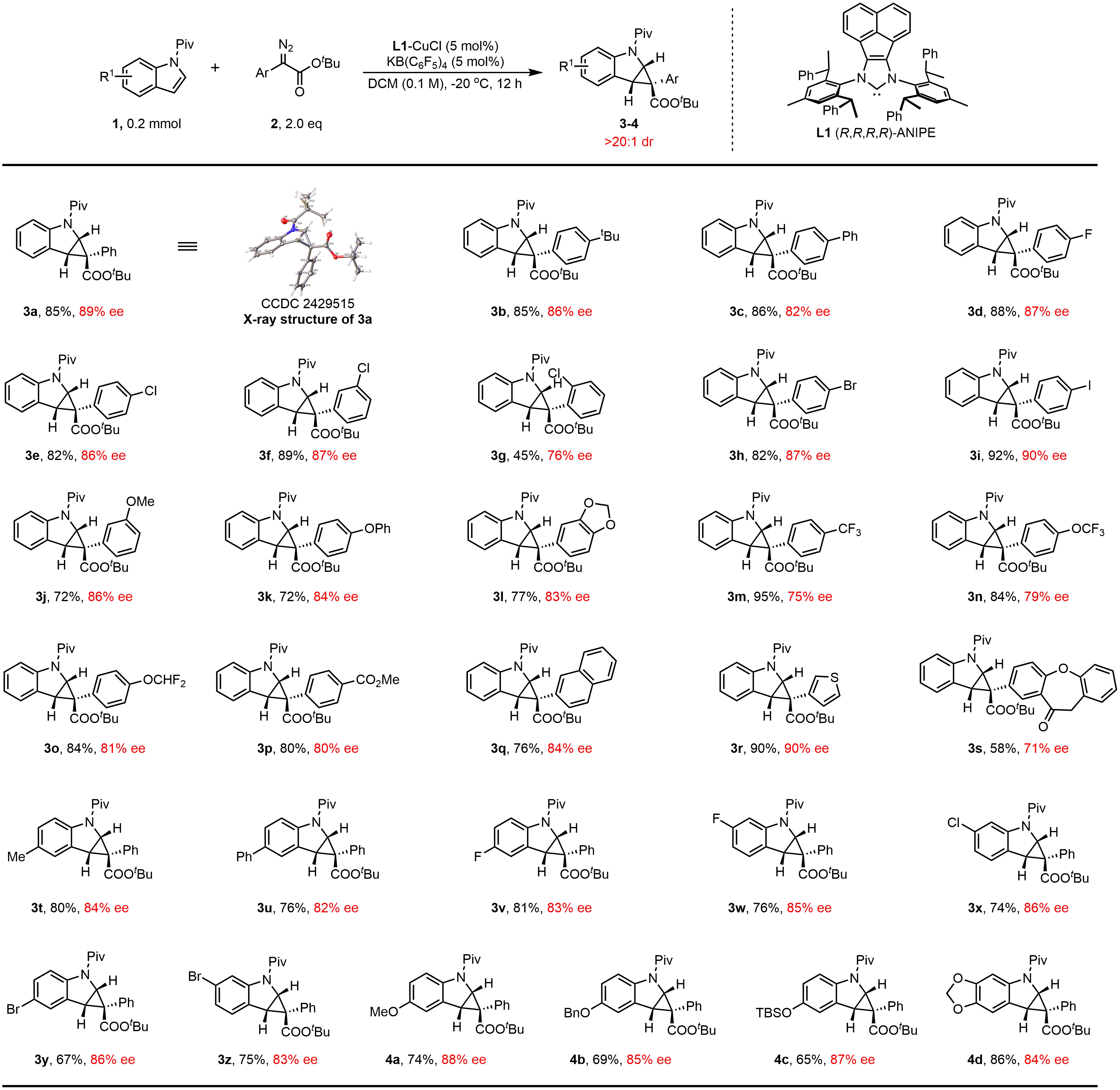 In a nitrogen-filled glovebox, an oven-dried screw-cap reaction tube equipped with a magnetic stir bar was charged with L1-CuCl (8.8 mg, 0.01 mmol, 5 mol%) and KB(C6F5)4 (7.2 mg, 0.01 mmol, 5 mol%), the indole substrate (0.2 mmol, 1.0 equiv.), and dichloromethane (1 mL). The reaction tube was sealed with a screw-cap septum and stirred at -20 °C for 1 hour. The diazo compound (0.4 mmol, 2.0 equiv.) was dissolved in dichloromethane (1 mL) and frozen at -20 °C for 1 hour before being slowly added dropwise to the reaction mixture. The reaction mixture was stirred within the sealed tube at -20 oC for 12 h. After the reaction was complete, the mixture was concentrated under reduced pressure to give the crude product. The diastereomeric ratio (d.r.) value of the crude products was determined by 1H NMR. The crude residue was purified via column chromatography to afford the desired product. The enantiomeric excess (ee) value was determined by chiral HPLC analysis of the isolated product.