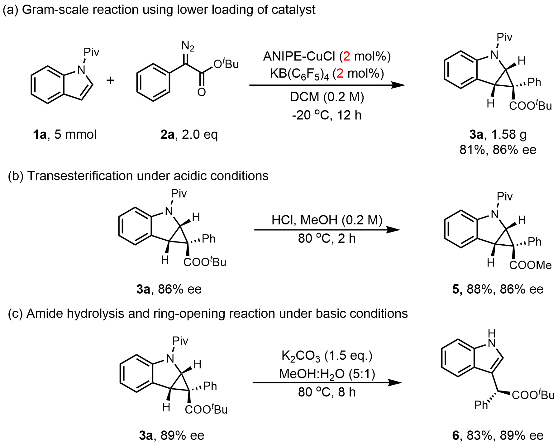 The operational robustness of this transformation was demonstrated on a gram-scale reaction. Notably, performing the reaction with 5 mmol of N-Piv indole 1a and 10 mmol of diazo ester 2a in dichloromethane, using just 2 mol% catalyst loading, afforded product 3a in 81% yield and 86% ee (Figure 3a). Further synthetic utility was illustrated by the transformation of 3a. Under acidic catalysis, transesterification of the ester moiety proceeded smoothly to furnish methyl ester 5 with complete retention of enantioselectivity (Figure 3b). Conversely, treatment with base promoted amide hydrolysis and ring-opening, yielding the C3-substituted indole derivative 6 while preserving stereochemical integrity (Figure 3c).