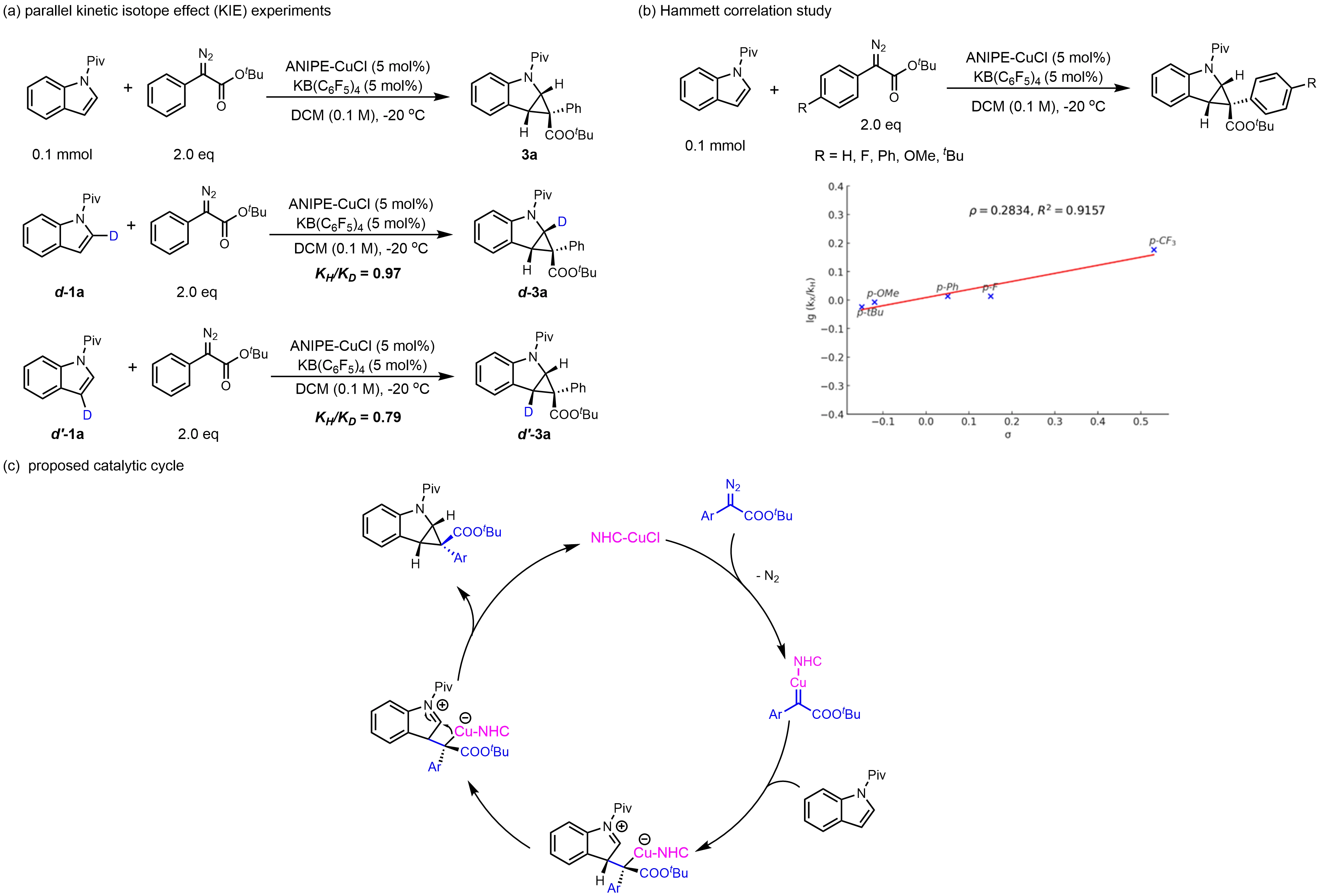 To gain insight into the reaction mechanism, a series of control experiments was conducted. Parallel kinetic isotope effect (KIE) studies using deuterated indoles revealed KIE values of 0.97 at the C2-position and 0.79 at the C3-position (Figure 4a). These observations suggest the presence of a secondary kinetic isotope effect, consistent with a change in hybridization from sp2 to sp3 at these positions during the reaction[54]. Subsequent Hammett analysis using para-substituted diazo esters established a linear free-energy relationship with a positive slope (ρ = 0.283, Figure 4b), indicating that the rate-determining step involves a transition state with partial negative charge accumulation[55]. Based on these experimental results and previous reports[22,56], a plausible catalytic cycle is proposed (Figure 4c). Initially, the NHC–Cu complex reacts with the diazo compound to extrude N2, generating a metal carbenoid intermediate. This is followed by nucleophilic attack of the indole at the carbene center to form a zwitterionic intermediate, which undergoes intramolecular cyclization to furnish the desired product. The use of our bulky yet flexible chiral NHC ligand is crucial for achieving effective control over both enantioselectivity and diastereoselectivity.
