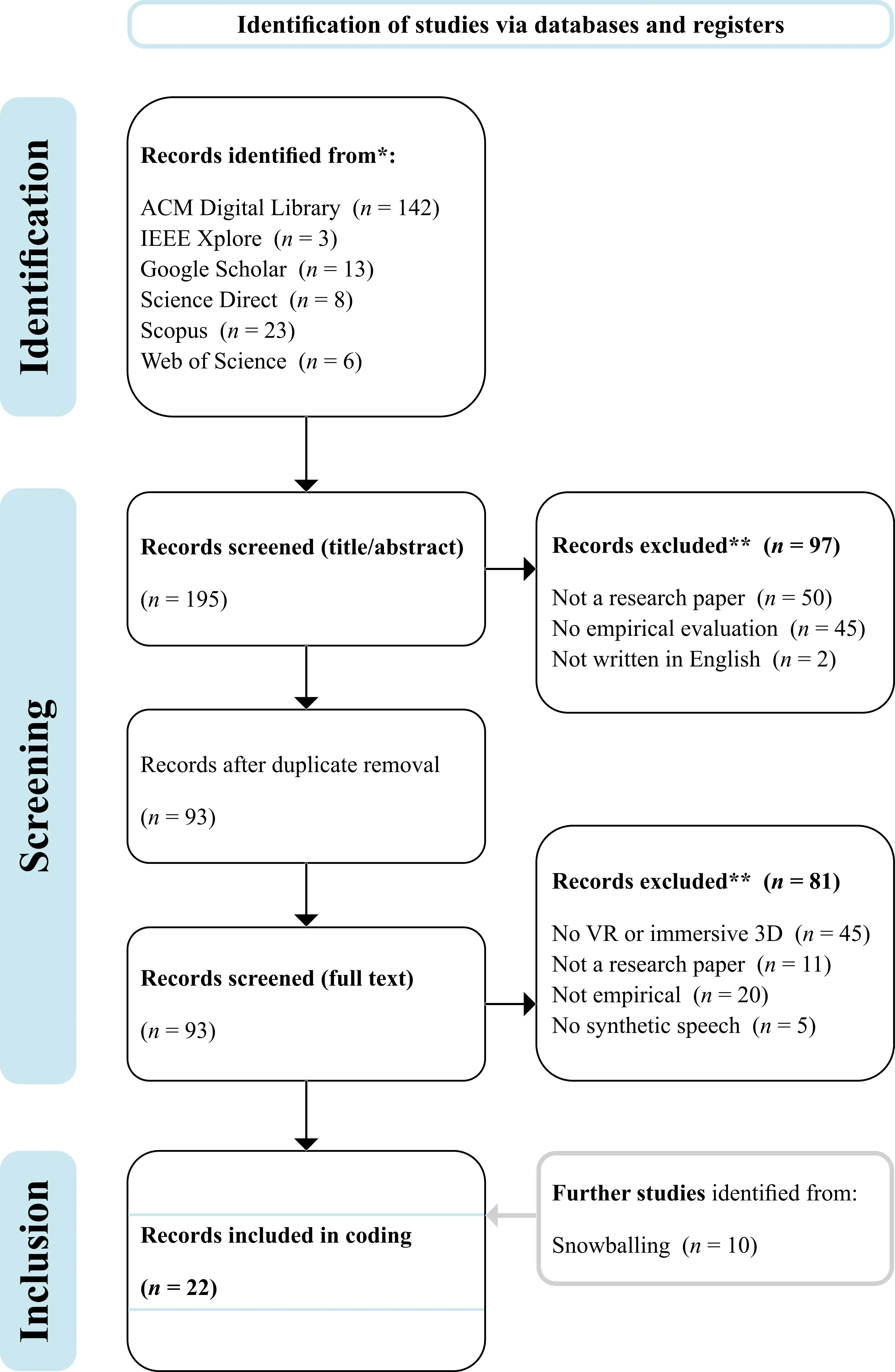 In HCI and user experience, key sources included the International Journal of Human-Computer Interaction, the Journal of Computer Assisted Learning, and the ACM International Conference on Intelligent User Interfaces. For affective and multimodal systems, research was drawn from the International Conference on Affective Computing and Intelligent Interaction, as well as journals such as Multimodal Technologies and Interaction and Expert Systems with Applications. Core venues for virtual agents and autonomous systems included the ACM International Conference on Intelligent Virtual Agents and the International Conference on Autonomous Agents and Multiagent Systems. Foundational contributions in virtual reality and immersive graphics were published in the IEEE Transactions on Visualization and Computer Graphics, the IEEE Conference on Virtual Reality and 3D User Interfaces, and the IEEE International Symposium on Mixed and Augmented Reality. Additional contributions came from graphics-focused conferences such as SIGGRAPH Motion, Interaction and Games and journals such as Computers & Graphics and Proceedings of the ACM on Computer Graphics and Interactive Techniques. Speech-specific research was represented by the Annual Conference of the International Speech Communication Association and the ACM Transactions on Applied Perception. Bibliographic information, including author names, abstracts, publication year, and venue, was imported into Zotero. After removing five duplicates, 93 publications remained for screening. Both authors independently reviewed all articles using predefined inclusion and exclusion criteria. Consensus was reached to include 12 studies and exclude 81.