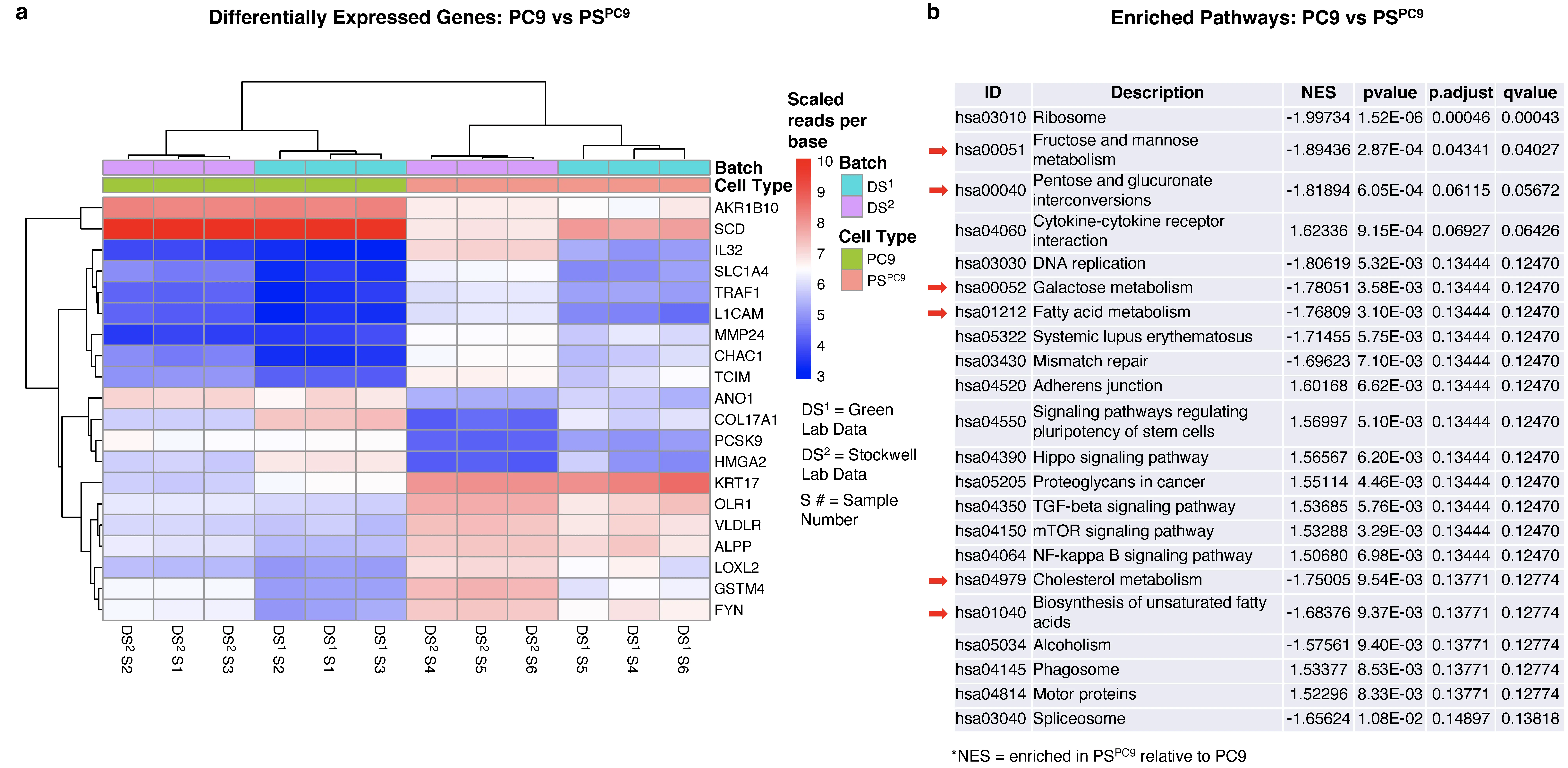 Figure 1. GSEA of PC9/PSPC9 reveals lipid and sugar metabolism as a key PS/parental differential. (a) The top 20 DGEs comparing PC9 vs PSPC9 with batch effect corrected in the combined gene expression data. Colored by scaled reads per base and generated using the Sleuth “plot_transcript_heatmap” function with transcripts clustered