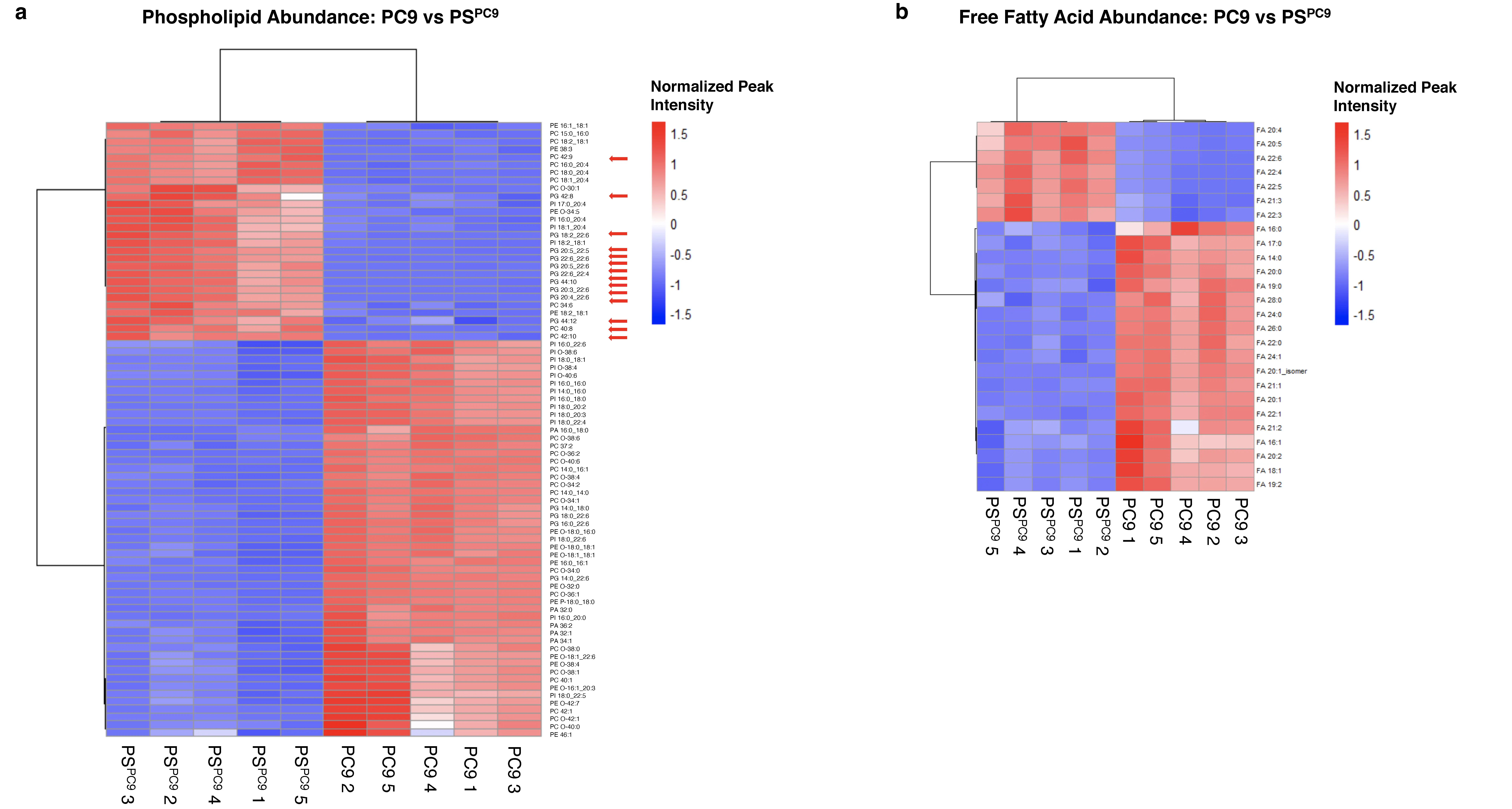 Figure 2. Untargeted lipidomics analysis of PC9/PSPC9 cells reveals that PSs have a ferroptosis-sensitive lipid profile enriched for diPUFA phospholipids. (a) Abundance of 79 PLs and (b) 26 FFAs changed significantly (FDR < .05) in PC9 vs PSPC9. Red arrows highlight diPUFA-PLs. 3 × 106 cells per sample for all cell types were plated. Independently cultured, erlotinib-treated biological replicates of PSs cultured in sufficient quantity to pool into n = 5 replicates; n = 5 independently cultured biological replicates of PC9. One-way ANOVA of normalized peak intensity with Euclidean distance and Ward clustering on rows and columns. PSs: persister cancer cells; diPUFA: di-polyunsaturated fatty acid phospholipids; FDR: false discovery rate; FFAs: free fatty acids; ANOVA: analysis of variance; PLs: phospholipids.