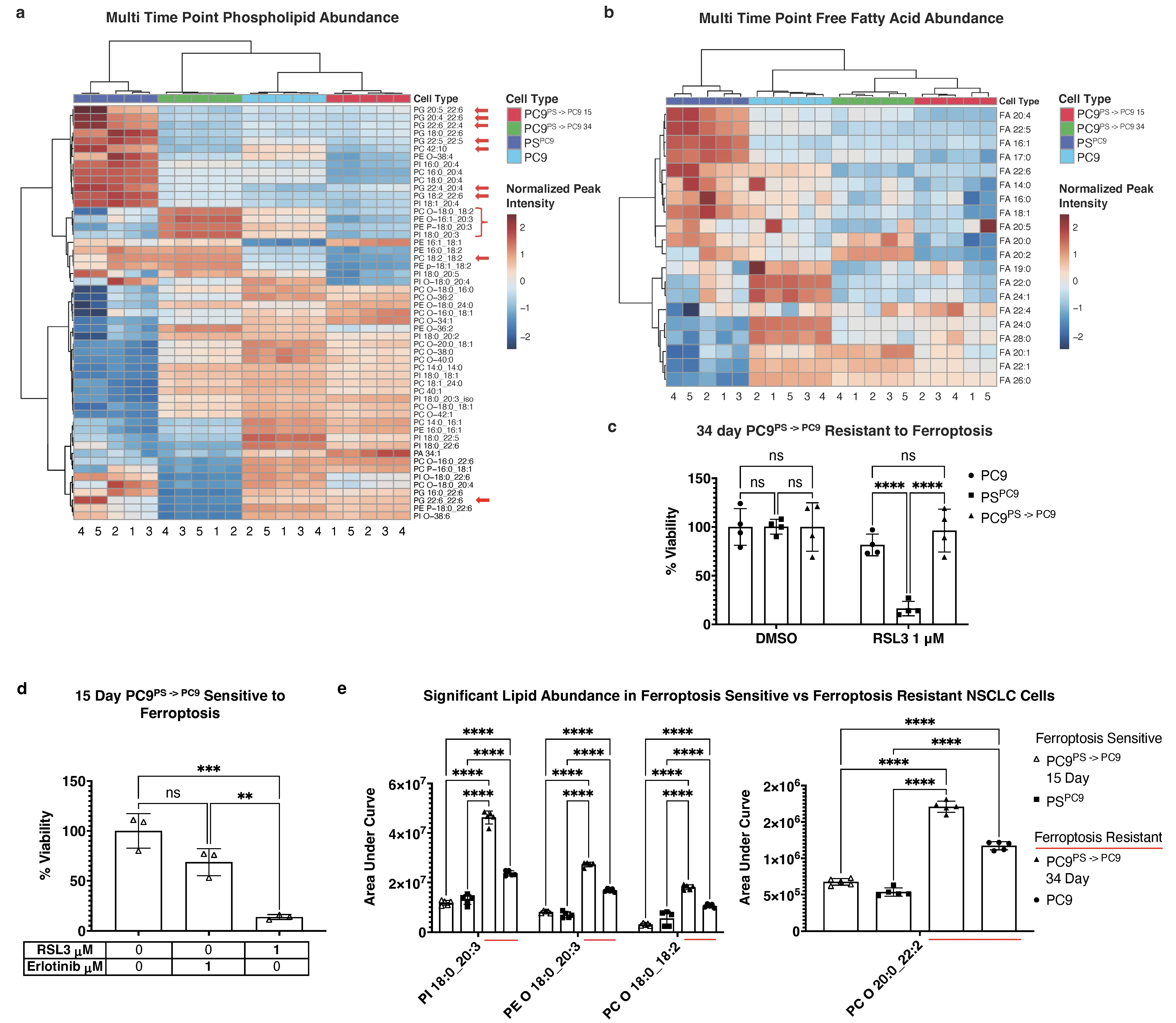 These results were intriguing given that, although the previous (Figure 2) results were reproduced, the ferroptosis-sensitive 15 day PC9PS -> PC9 reverters (Figure 3d) had a lipid profile more similar to ferroptosis resistant PC9s and 34 day reverted PC9PS -> PC9 cells. We therefore examined other lipids that were differentially abundant between the ferroptosis-resistant PC9 cells and 34 day reverted