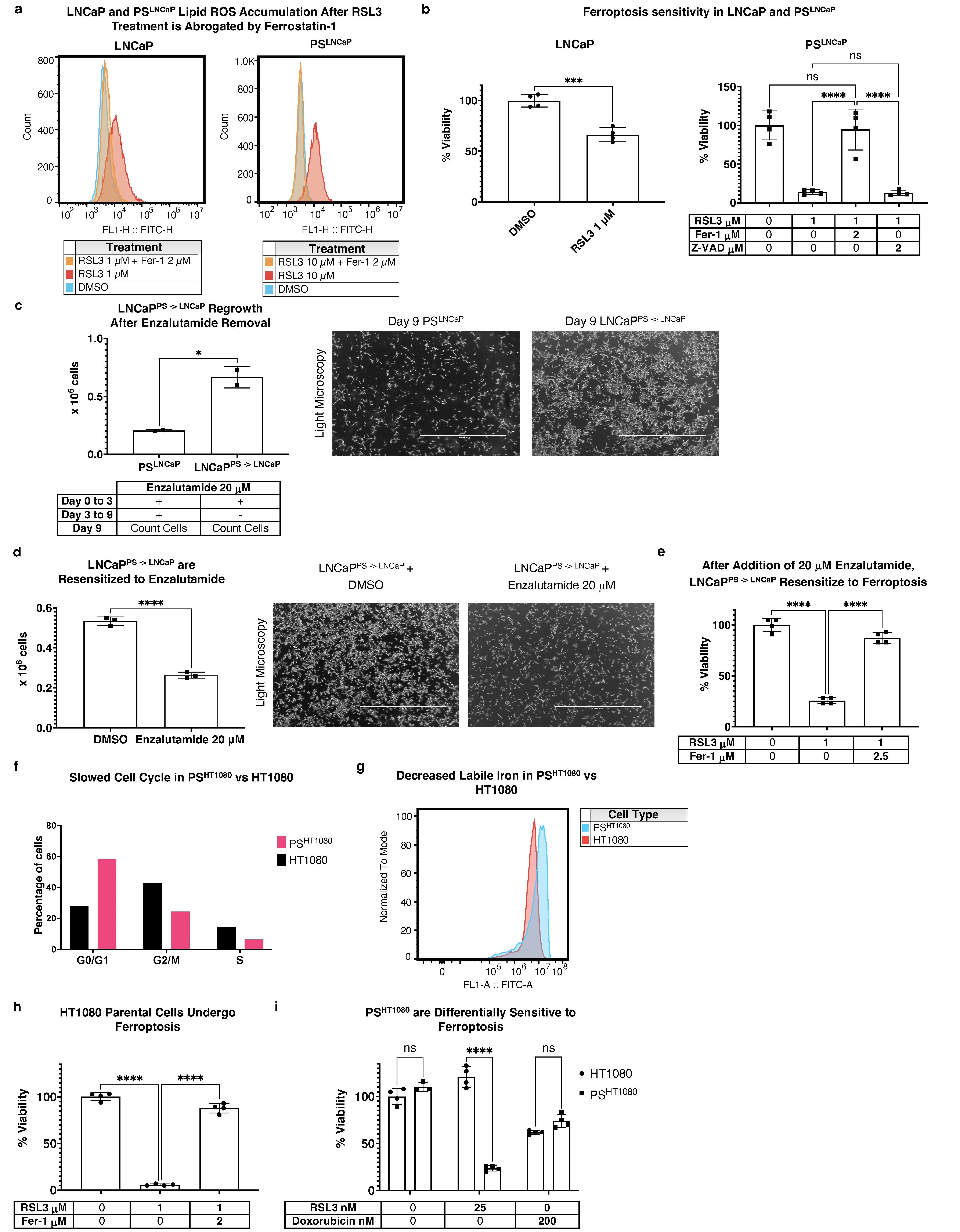 PSLNCaP and PSHT1080 were derived and maintained as described above. The same approach was taken for both cell line types: on approximately day 6 (between 5-8 days) of PS culture, both PS and a parental cell cohorts were trypsinized, counted, and equal numbers were then replated in 10 cm dishes. Cells were then treated with DMSO (Sigma-Aldrich #276855), Ras Selective Lethal 3 (RSL3), and Ferrostatin-1 (Sigma-Aldrich, #SML0583) at concentrations, combinations, and time points indicated in 5% CO2 at 37 °C. Cells were then collected, centrifuged at 300 g for 5 min, washed with HBSS, and incubated with HBSS containing 2.5 µM