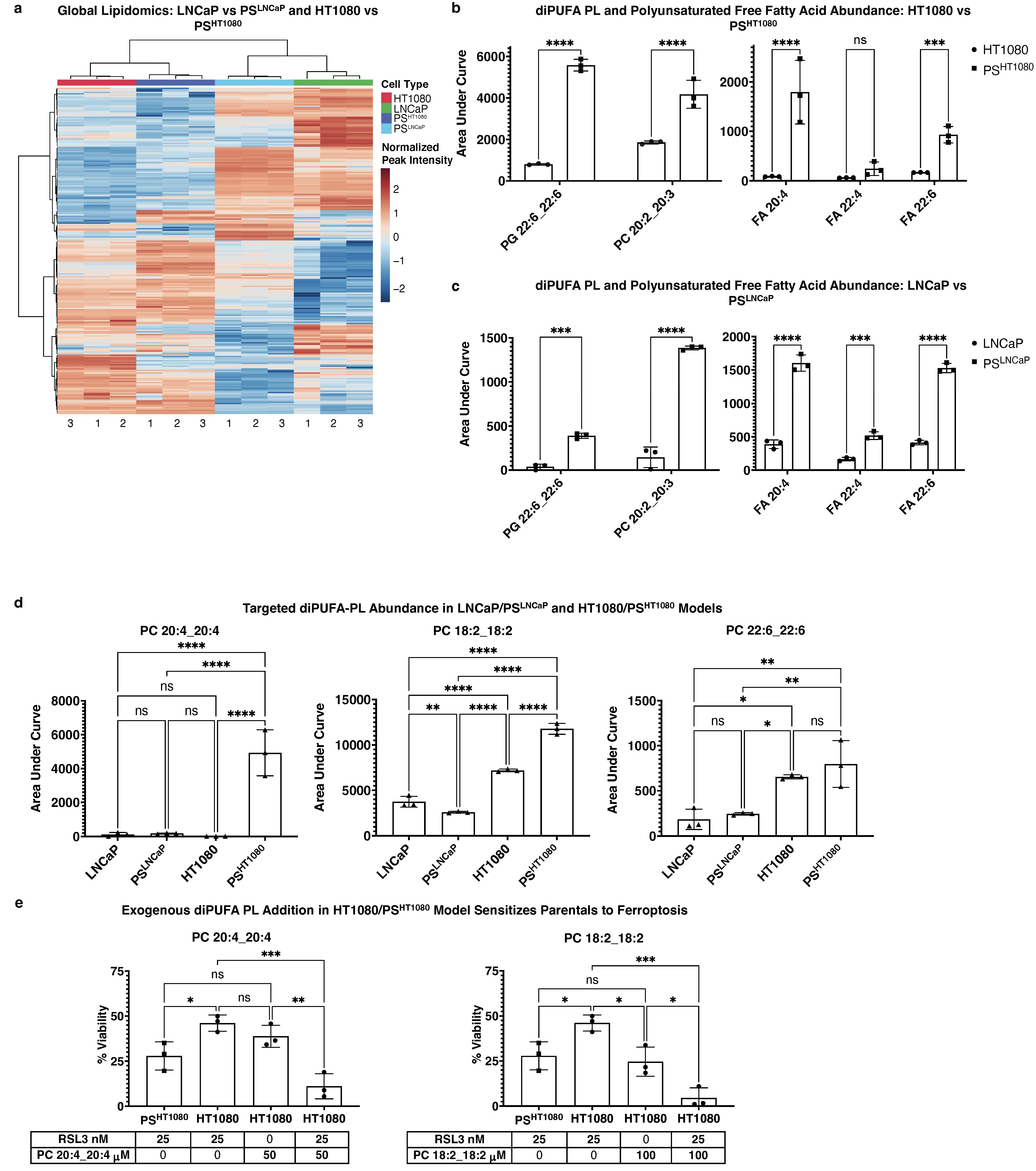 Exogenous addition of PUFAs sensitizes cells to ferroptosis[20,46]; when diPUFA-PLs identified as differentially abundant in PSHT1080 persisters (e.g., PC(18:2_18:2)) were added to parental HT1080 cells, they were sensitized to ferroptosis to at least the level of the