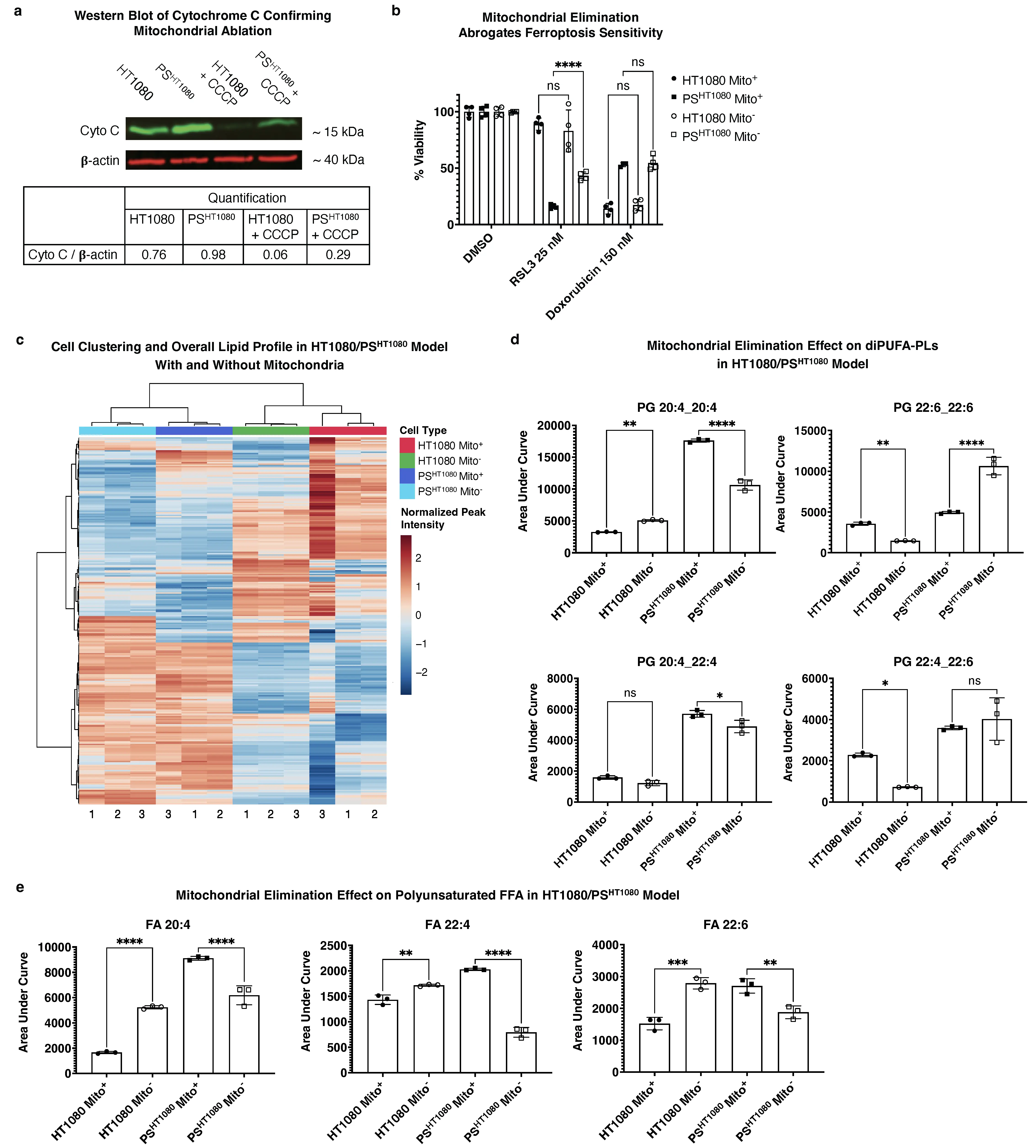 Figure 6. Mitochondrial elimination in PSHT1080 reverts PS ferroptosis sensitivity and alters the lipid profile. (a) Western blot of Cytochrome C (~15 kDa) with β-actin (~40 kDa) as control of parkin expressing HT1080 (Mito+) vs PSHT1080 (Mito+) vs HT1080 + CCCP (Mito-) vs PSHT1080 + CCCP (Mito-) and (b) 56hr CTG viability assay of 25 nM RSL3 or 150 nM doxorubicin treated fibrosarcoma cells under same conditions; CCCP is a mitochondrial uncoupling agent that in cells expressing parkin protein results in mitochondrial elimination as previously described[34]. n = 8 and n = 12 independently cultured, doxorubicin treated biological replicates of PS for Mito+ and Mito-, respectively, pooled into