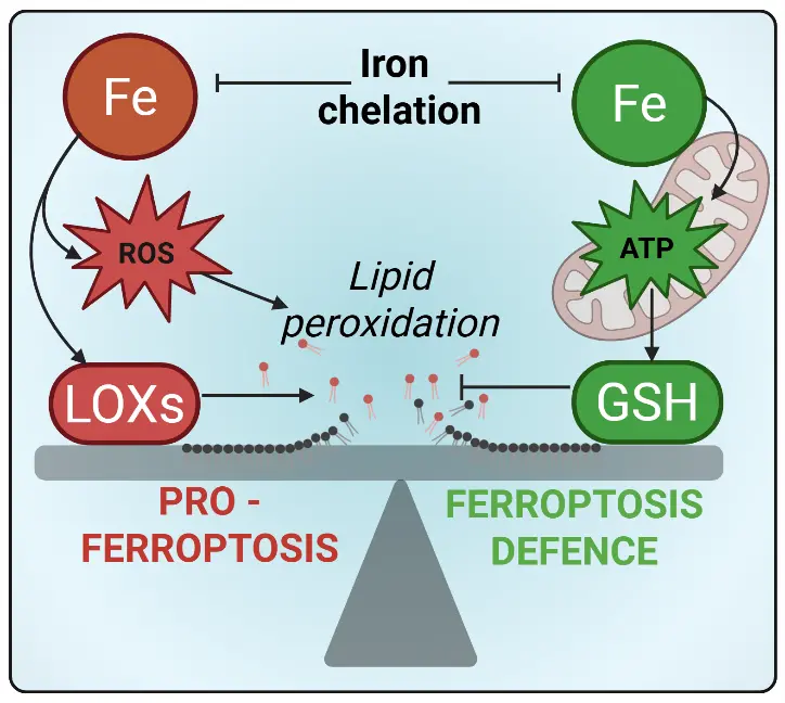 Iron’s role as the protagonist in ferroptosis centres on its ability to cycle between ferrous and ferric states, enabling electron transfer and redox coupling with reactive oxygen species (ROS) generation such as hydrogen peroxide[1]. The resultant hydroxyl radicals can initiate a chain reaction of lipid peroxidation of polyunsaturated fatty acid species that destabilize cellular membranes, leading to cell rupture and death[2]. In addition, iron-containing enzymes, including lipoxygenases, have been shown to accelerate lipid oxidation[3,4]. Even before the term ‘ferroptosis’ was coined, studies demonstrated a link between iron and lipid peroxidation when iron dextran injected into healthy mice caused peroxide formation in adipose tissue that was mitigated by vitamin E, a bona fide anti-ferroptotic radical chain-reaction quencher[5-7].