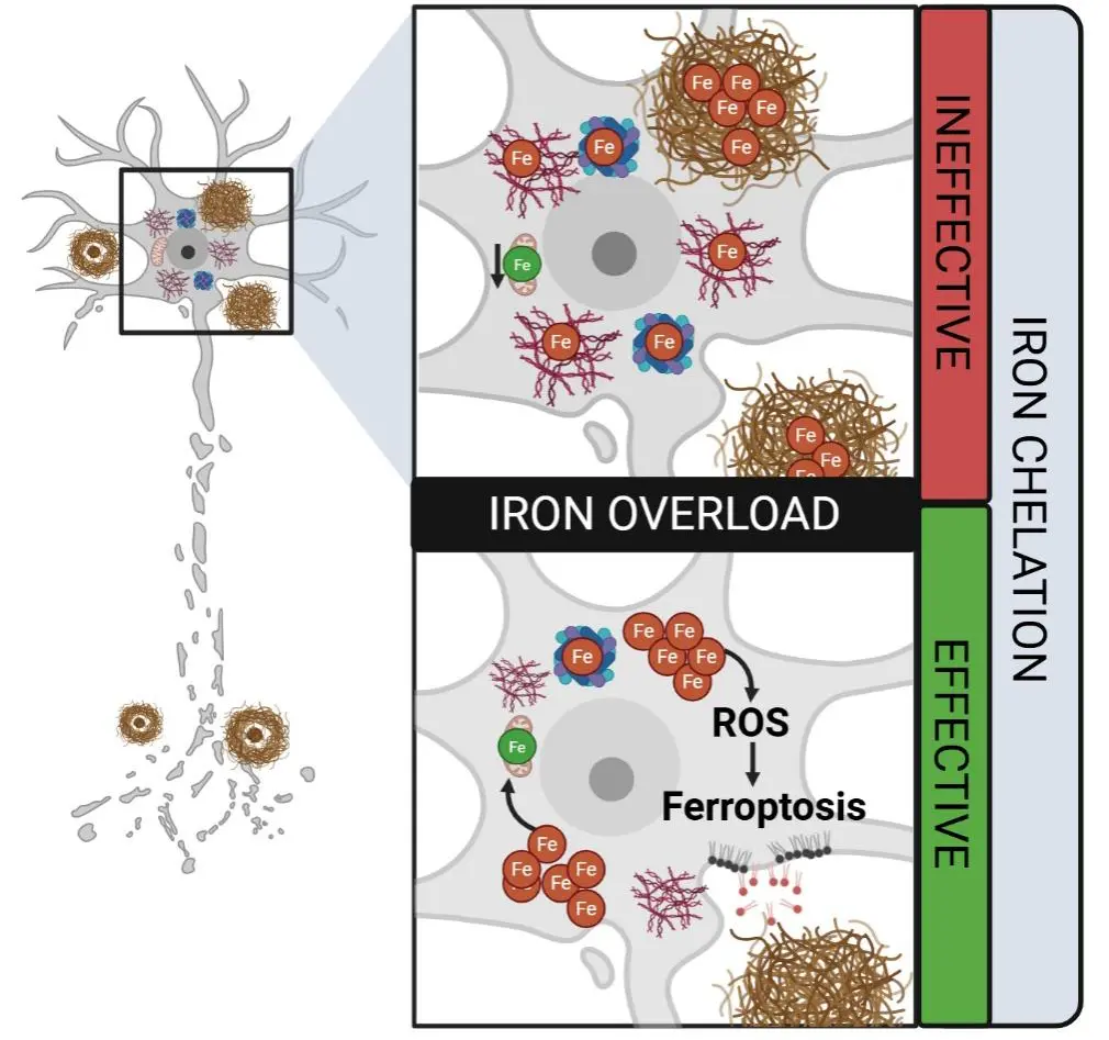 Figure 2. Distinct forms of “iron overload” and their implications for iron-chelation efficacy. Cells may appear iron-overloaded, yet much of the iron can be sequestered in pathological aggregates (such as neurofibrillary tangles, amyloid plaques), or trapped in ferritin, rendering it inaccessible for normal mitochondrial function. In this scenario, chelation is ineffective because the excess iron is not part of the labile iron pool. Conversely, when iron overload reflects an accumulation of labile, redox-active iron, this promotes ROS generation and lipid peroxidation, driving ferroptosis. Under these conditions, iron chelation is likely effective in reducing oxidative stress and mitigating ferroptotic cell death. Created in Biorender.com. ROS: reactive oxygen species.