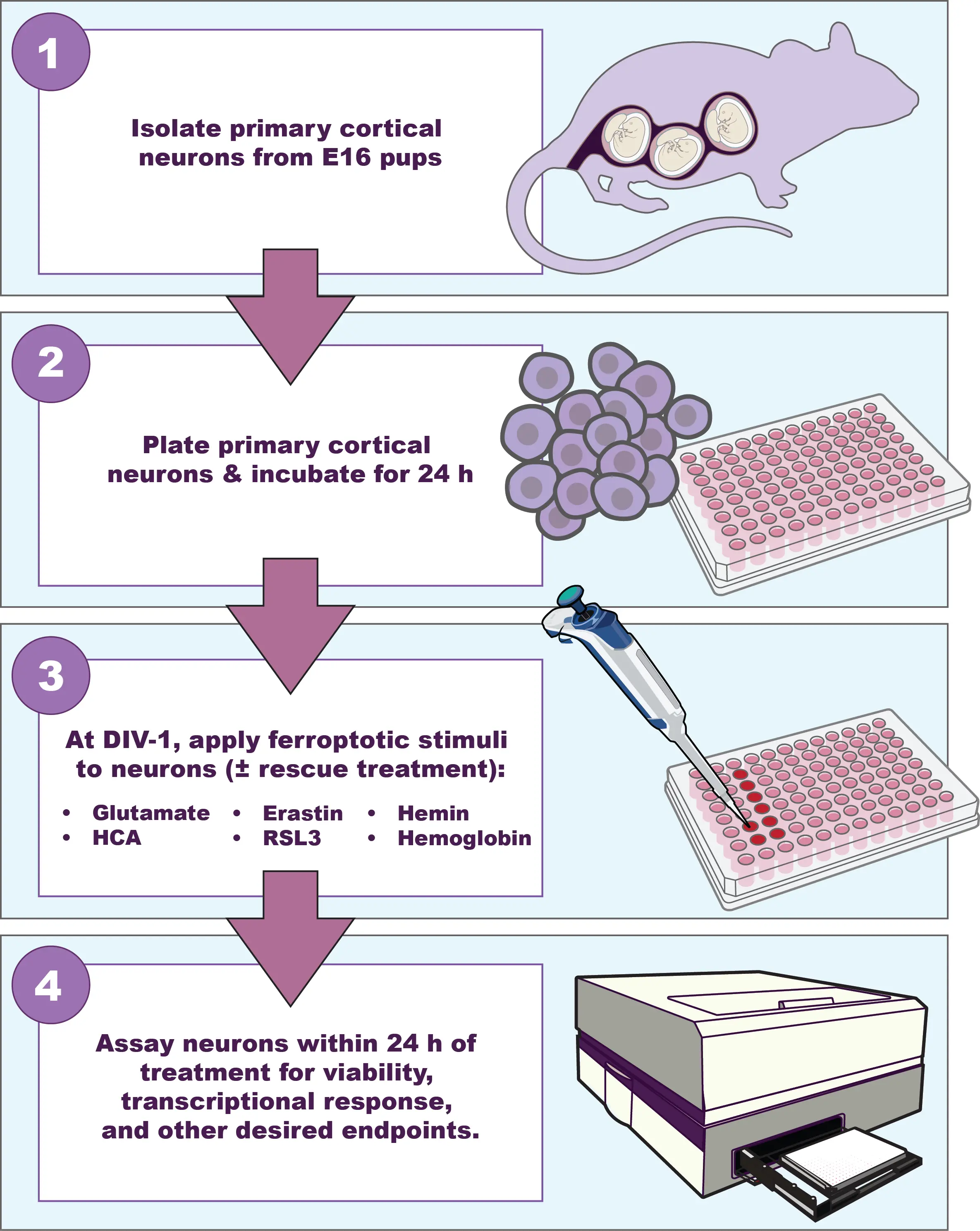 Figure 1. To model ferroptosis in neurons following ischemic or hemorrhagic stroke, our laboratory isolates primary cortical neurons from E16 rat pups, which are incubated for at least 24 hours. After DIV-1, immature neurons are treated with glutamate, HCA, erastin, or RSL3 to model ischemic stroke. Alternatively, cultures are treated with hemin or hemoglobin to model hemorrhagic stroke. Neurons are assayed within 24 hours of treatment for viability, transcriptional responses, and other endpoints. DIV: days in vitro; HCA: homocysteic acid; RSL3: RAS-selective lethal 3.
