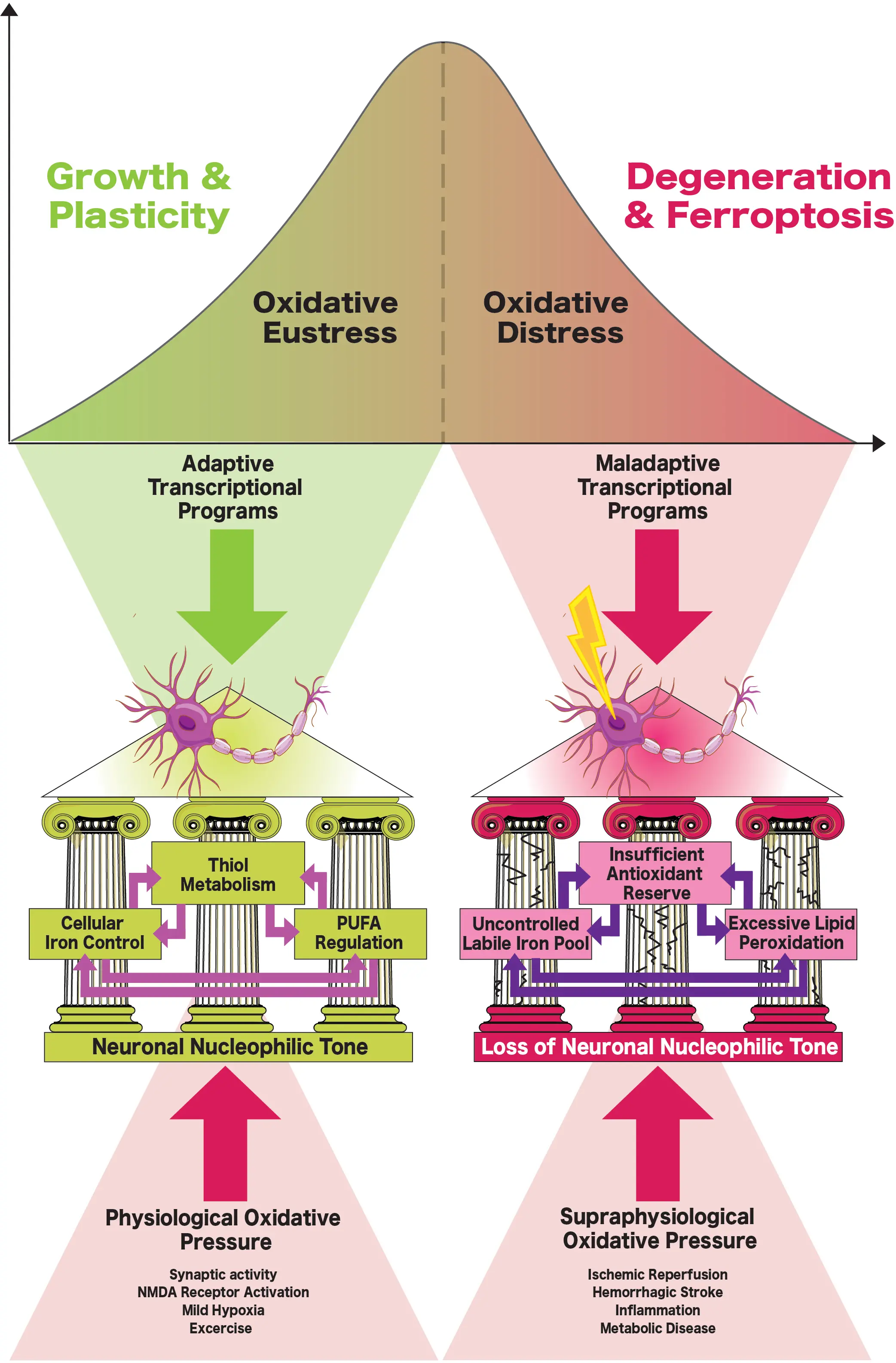Figure 2. In order to balance physiological oxidative pressure and maintain growth and plasticity (e.g., oxidative eustress), the “three pillars” of oxidative metabolism must remain intact: cellular iron control, thiol metabolism (e.g., cysteine and GSH), and regulation of PUFAs. Loss of any one pillar under supraphysiological oxidative pressure (such as following stroke) disrupts regulation of the others, resulting in maladaptive transcriptional programs that sway neurons towards uncontrolled oxidative distress, and eventually, cellular degeneration and ferroptosis. Following ischemic stroke, thiol metabolism is the first “lost pillar”, as energetic deficits impair GSH synthesis and recycling, which in turn disrupts labile iron control and allows lipid peroxidation to proceed unchecked. In hemorrhagic stroke, the first “lost pillar” is cellular iron control, as excessive iron from blood breakdown products overwhelms antioxidant defenses, permitting runaway lipid peroxidation. GSH: glutathione; PUFAs: polyunsaturated fatty acids.