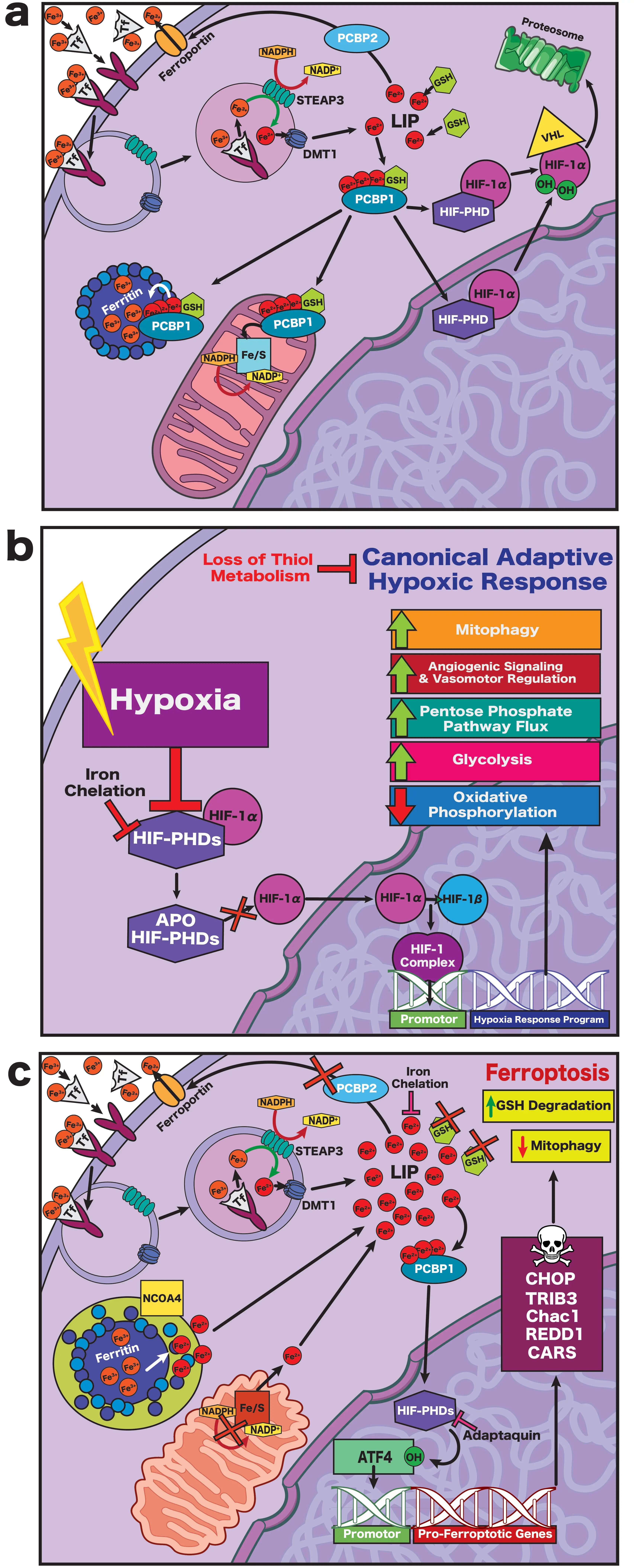 Figure 3. (a) Under normal physiological circumstances, ferrous iron (Fe3+) is imported into neurons via transferrin-mediated endocytosis. Inside the endosome, ferric iron is reduced to ferrous iron (Fe2+) by STEAP3 and exported into the cytosol via DMT1, contributing to the LIP. The LIP is tightly regulated; ferrous iron within the LIP is stabilized by forming a complex with GSH, with excess ferrous iron exported via PCBP2 and ferroportin. Iron chaperone PCBP1 delivers ferrous iron from the LIP either to ferritin for storage, to the mitochondria for iron-sulfur cluster formation, or to metalloenzymes such as the hypoxia-inducible factor. Under normal circumstances, HIF PHDs hydroxylate HIF-1α, tagging it for proteasomal degradation upon ubiquitination by VHL; (b) When neurons undergo hypoxia, the lack of oxygen inactivates HIF PHDs, leaving them unable to hydroxylate HIF-1α. This prevents the degradation of HIF-1α, allowing it to translocate to the nucleus where it binds to HIF-1β to form the HIF-1 complex. The HIF-1 complex binds to hypoxia response elements, promoting expression of a coordinated gene program that allows the cell to adapt to hypoxic conditions- as long as thiol metabolism remains intact. Because the HIF PHDs require iron as a co-factor, iron chelation also permits HIF-1α stabilization; (c) When thiol metabolism is compromised and GSH is depleted, control of the LIP is lost, tipping neurons into oxidative distress. Ferrous iron export is downregulated, and import is upregulated. Ferritinophagy and dissociation of the Fe-S clusters further expands the LIP, loading PCBP1 with ferrous iron and redirecting it to the HIF PHDs. Once loaded with iron within an oxidative environment, the HIF PHDs (likely HIF PHD1) preferentially hydroxylate ATF4, resulting in the transcription of a pro-ferroptotic gene cassette. STEAP3: six-membrane epithelial antigen of prostate 3; DMT1: divalent metal ion transporter 1; LIP: labile iron pool; GSH: glutathione; PCBP2: poly(rc)-binding protein 2; PCBP1: poly(rc)-binding protein 1; HIF PHDs: hypoxia-inducible prolyl hydroxylases; VHL: von Hippel-Lindau tumor suppressor protein; HIF-1α: hypoxia-inducible factor 1α; HIF-1β: hypoxia-inducible factor 1β.