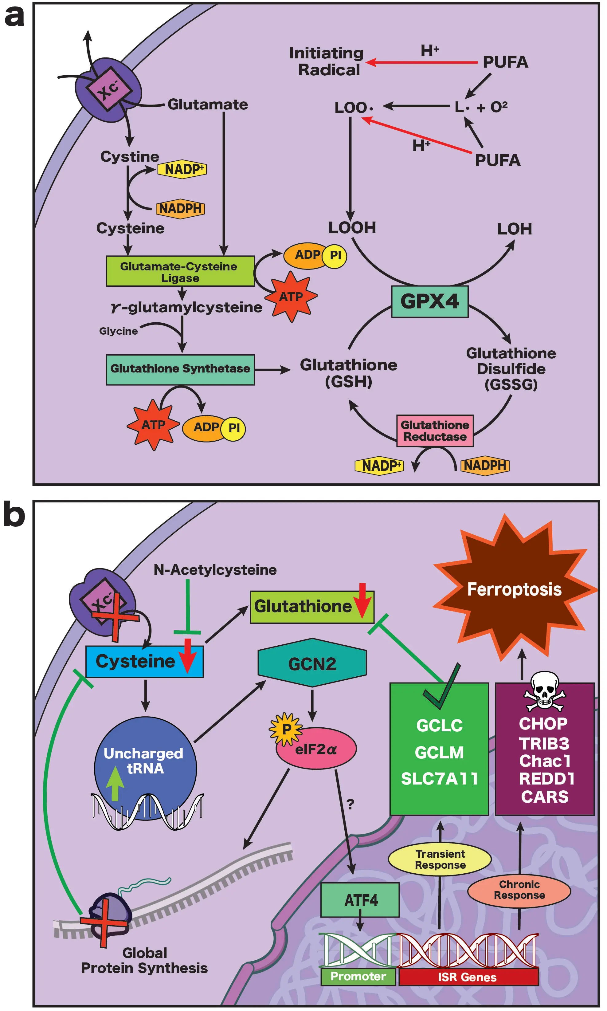 Figure 4. (a) In astrocytes and immature neurons, cystine is imported into the cell in exchange for glutamate via the system Xc- transporter. Cystine is converted to cysteine, which is then converted to γ-glutamylcysteine by glutamate-cysteine ligase. Glutathione synthetase then acts on γ-glutamylcysteine and glycine to produce GSH. GPX4 uses GSH as a reducing agent to neutralize toxic lipid hydroperoxides, forming GSSG. Glutathione reductase then recycles GSSG back into GSH in an NADPH-dependent reaction; (b) Upon depletion of cellular cysteine supply, uncharged tRNA builds up within the neuron, activating GCN2, which in turn activates eIF2. Activation of eIF2α triggers the integrated stress response, globally reducing protein synthesis, and redirects cysteine away from translation towards glutathione production. While the upstream ferroptotic triggers for ATF4 activation in neurons are incompletely understood, they may include eIF2α phosphorylation or association with an unidentified co-factor. Data from other models (e.g., immortalized neuronal cell lines, non-neuronal cells) suggest that transient ATF4 activation is beneficial, resulting in expression of antioxidant gene programs which act to increase cellular cysteine and GSH levels. Chronic ATF4 activation, however, results in pro-ferroptotic transcription and eventual death. Notably, delivering cysteine to the cell in the form of N-acetylcysteine prevents neuronal ferroptosis. GSH: glutathione; GPX4: glutathione peroxidase 4; GSSG: glutathione disulfide; NADPH: nicotinamide adenine dinucleotide phosphate; GCN2: general control nonderepressible 2; eIF2α: eukaryotic initiation factor 2 subunit 1; ATF4: activating transcription factor 4.