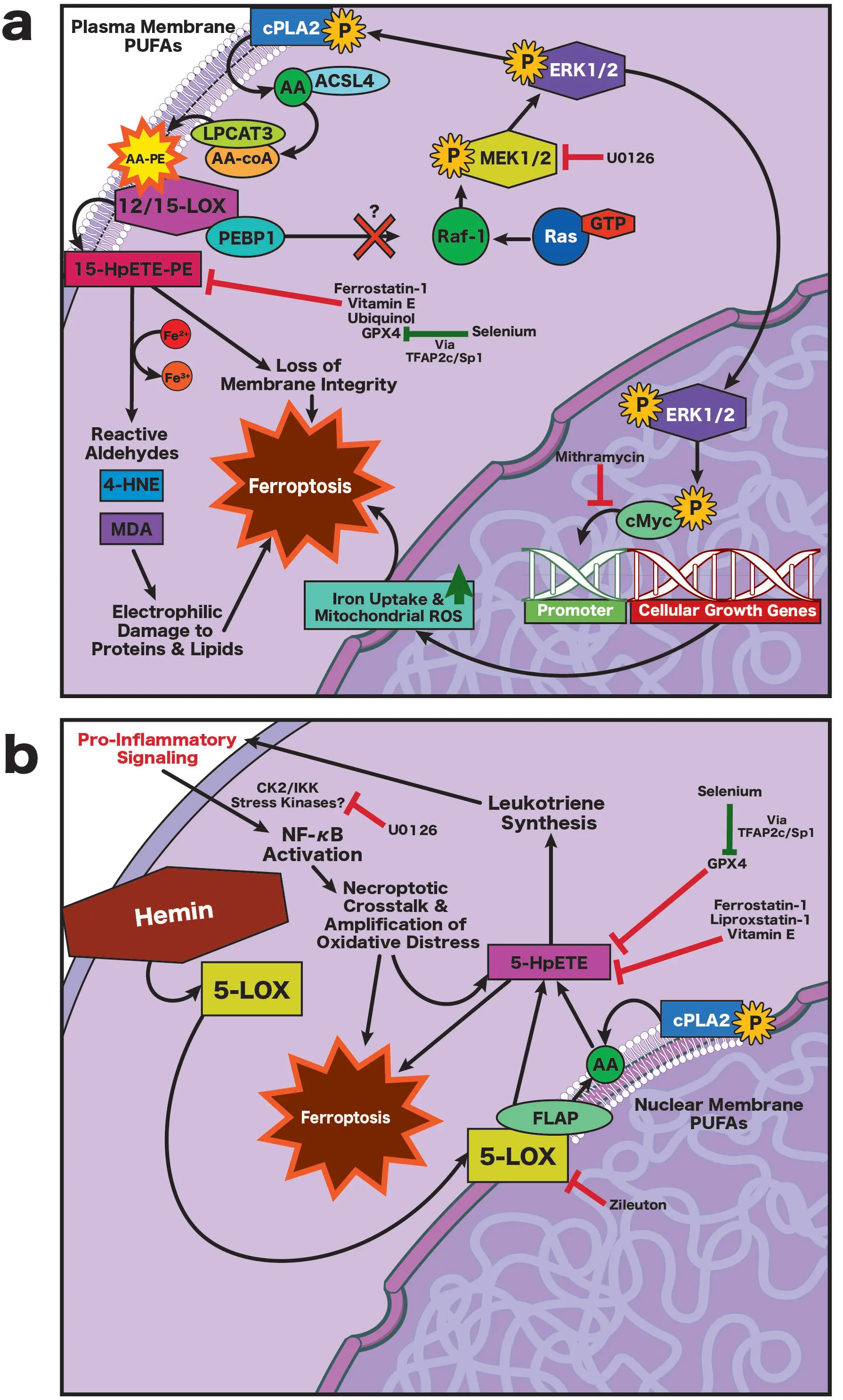 Figure 5. (a) Ischemia-induced ferroptosis. Oxidative stress dissociates PEBP1 from Raf-1, enabling Ras-Raf-MEK1/2-ERK1/2 signaling that activates cPLA2, releasing AA from membrane PUFAs. AA is reincorporated into PE by ACSL4 and LPCAT3 and oxidized by 12/15-LOX to form 15-HpETE-PE, compromising membrane integrity and generating toxic aldehydes (4-HNE, MDA). ERK1/2 also activates cMyc, promoting iron overload and mitochondrial ROS, thereby accelerating ferroptosis. This pathway is inhibited by U0126 and mithramycin; (b) Hemorrhage-induced ferroptosis. Hemin inserts into membranes, promoting formation of a 5-LOX/FLAP complex at the nuclear envelope, where free AA is converted to 5-HpETEs and leukotrienes, amplifying inflammation via CK2/IKK-NF-κB signaling, lipid peroxidation, and generation of toxic aldehydes. This process is independent of ERK1/2 activity; the protective effect of U0126 in this context reflects off-target inhibition of CK2/IKK signaling. In both models, ferroptosis is suppressed by radical-trapping antioxidants or upregulation of GPX4, which is enhanced by selenium via TFAP2c/Sp1-dependent GPX4 induction. AA: arachidonic acid; ACSL4: long-chain fatty acid-CoA ligase 4; cMyc: cellular Myc proto-oncogene; cPLA2: cytosolic phospholipase A2; CK2: casein kinase 2; ERK1/2: extracellular signal-regulated kinases 1 and 2; FLAP: 5-lipoxygenase–activating protein; GPX4: glutathione peroxidase 4; 4-HNE: 4-hydroxynonenal; IKK: IκB kinase; LPCAT3: lysophosphatidylcholine acyltransferase 3; LOX: lipoxygenase; 12/15-LOX: 12/15-lipoxygenase; 5-LOX: 5-lipoxygenase; MDA: malondialdehyde; MEK1/2: mitogen-activated protein kinase kinase 1 and 2; NF-κB: nuclear factor kappa-light-chain-enhancer of activated B cells; PE: phosphatidylethanolamine; PEBP1: phosphatidylethanolamine-binding protein 1; PUFAs: polyunsaturated fatty acids; Raf-1: proto-oncogene serine/threonine-protein kinase Raf-1; Ras: rat sarcoma; ROS, reactive oxygen species; TFAP2c: transcription factor AP-2 gamma; Sp1: specificity protein 1; 15-HpETE-PE: 15-hydroperoxy-eicosatetraenoyl-phosphatidylethanolamine; 5-HpETE: 5-hydroperoxy-eicosatetraenoic acid.