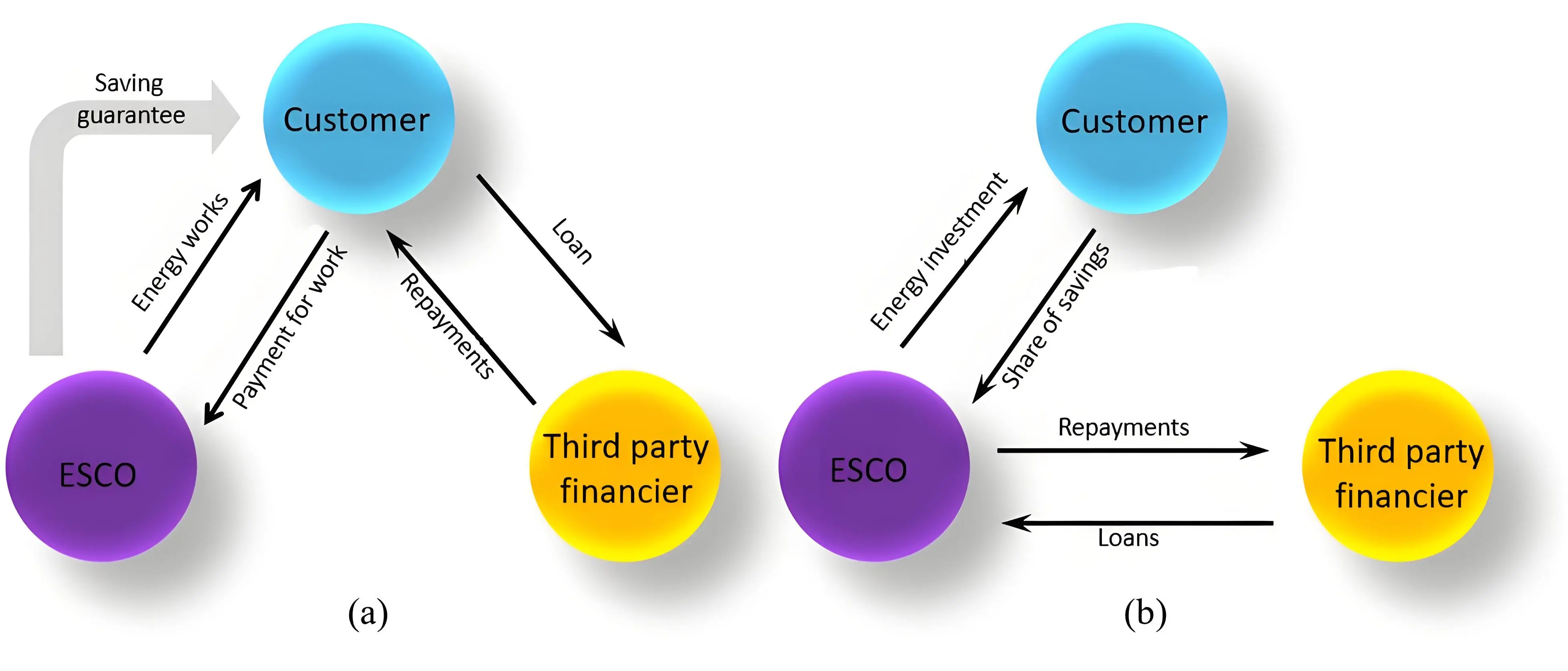 | Guaranteed savings contract | Customer | Loan to customer | Fixed payment schedule: ESCOs cover the shortfall in savings and have no added benefit if savings are exceeded. |