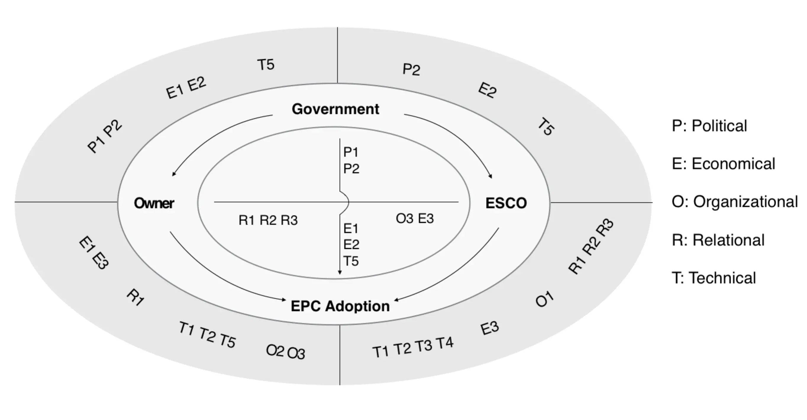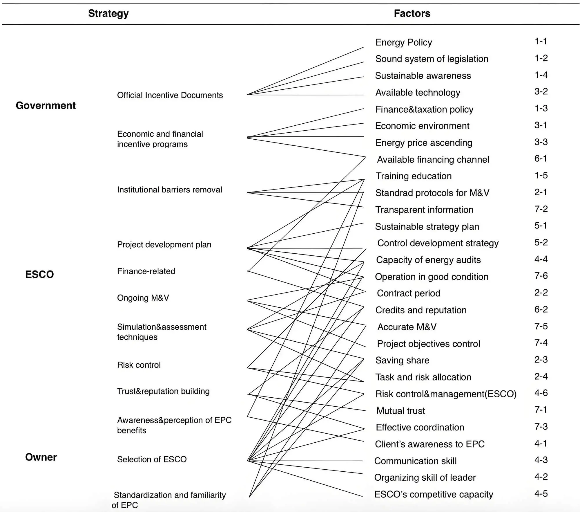 | 1. Government support | Government plays a critical role in paving the road for EPC adoption and support for EPC success. They provide guidance, practices, and legislation. | 1-1 Energy policy of the local government | Government | [13,57,66] |