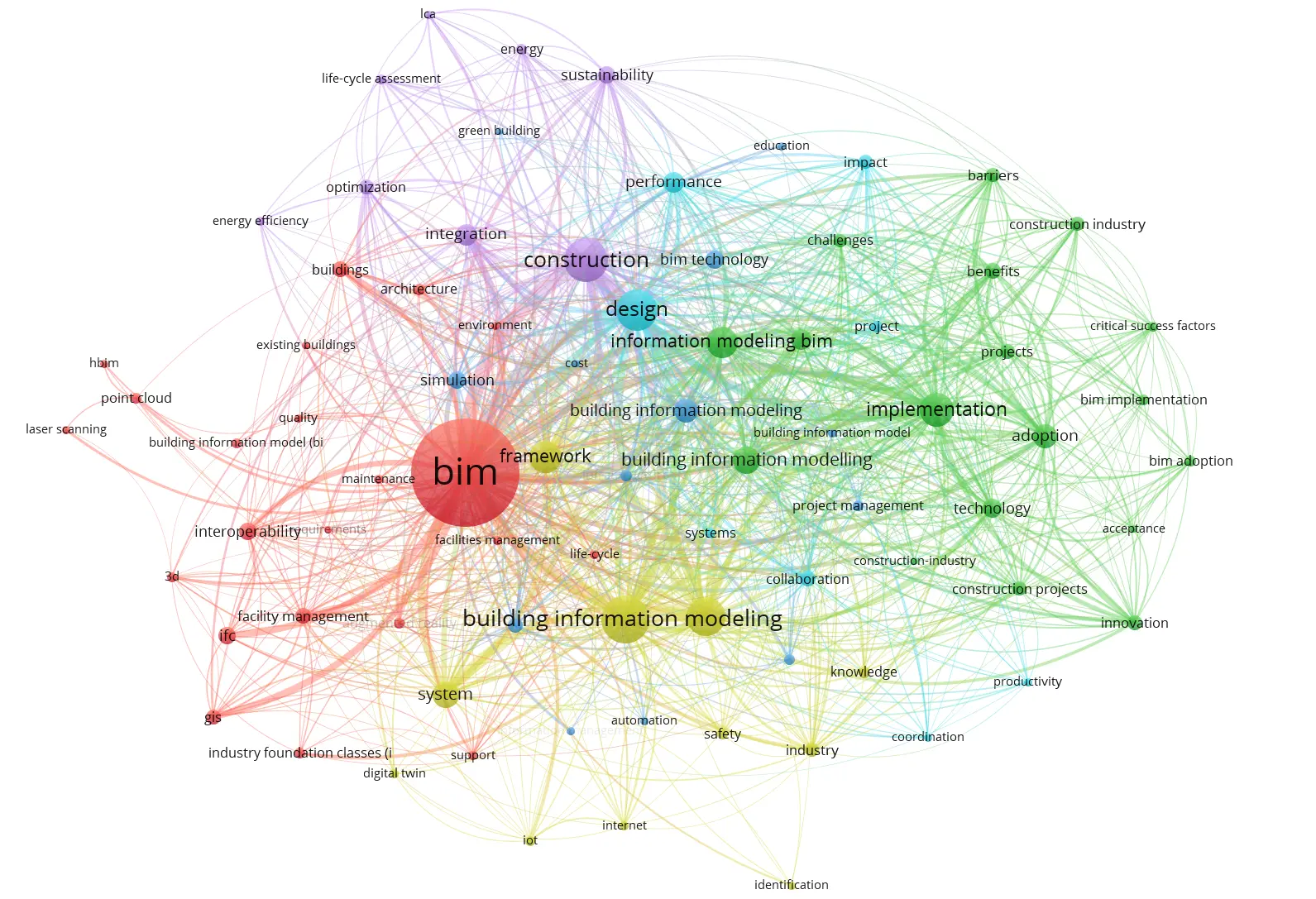 Through VOSviewer, we extracted the articles about BIM in Web of Science and cluster their keywords to get Figure 2, which is the co-occurrence network map of keywords about BIM. The figure illustrates that current research hotspots about BIM mainly revolve around modeling, implementation, construction and design. The strong interconnections among these areas indicate that the research on BIM has reached a relatively mature stage. Moreover, the main content of the research concentrates on BIM’s functions and references, underscoring its significant and irreplaceable role in the construction industry.