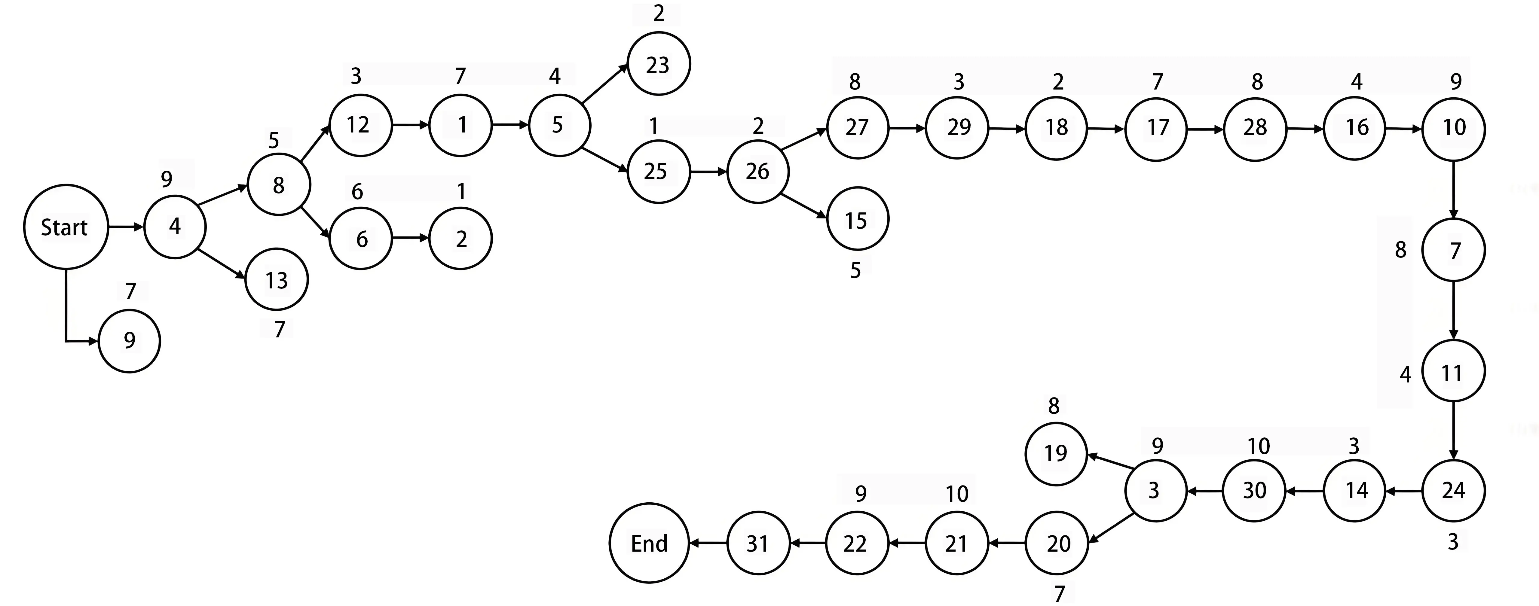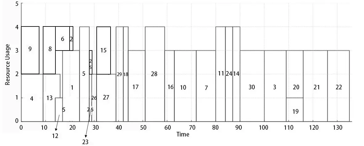 As aforementioned, we observed that DRL-based approaches, including DQN and PPO, yielded higher project values and shorter schedules on MSRCPSP instances compared to heuristic and metaheuristic algorithms, with the PPO-based scheduling agent consistently demonstrating superior performance. To visualise the scheduling solutions, the detailed solution processes of the selected instances are also generated. Since PPO provides the highest count of optimal solutions and the shortest schedule in most cases, a PPO-solved schedule is presented as the visualisation example. Figure 3 presents an example AON diagram based on the selected project instance. The diagram clearly demonstrates the workflow and preceding relationships among the tasks. Figure 4 shows the visualisation of the same solution example, where the x-axis represents the accumulated time of the project and the y-axis denotes the resource usage of each activity. Each rectangular block corresponds to a task labelled with its ID, whose width reflects its duration and height indicates the level of resource consumption. The schedule demonstrates how multiple tasks are arranged sequentially and concurrently while respecting the maximum resource capacity of four units. In the provided example, multiple tasks in the early phase overlap with each other, whereas around day 80-90, tasks like 11, 24 and 14 are conducted in order, fully utilising the available resource capacity. There are only 4 skilled resources available throughout the project lifecycle, which has not been exceeded by the resource usage in the generated solution.