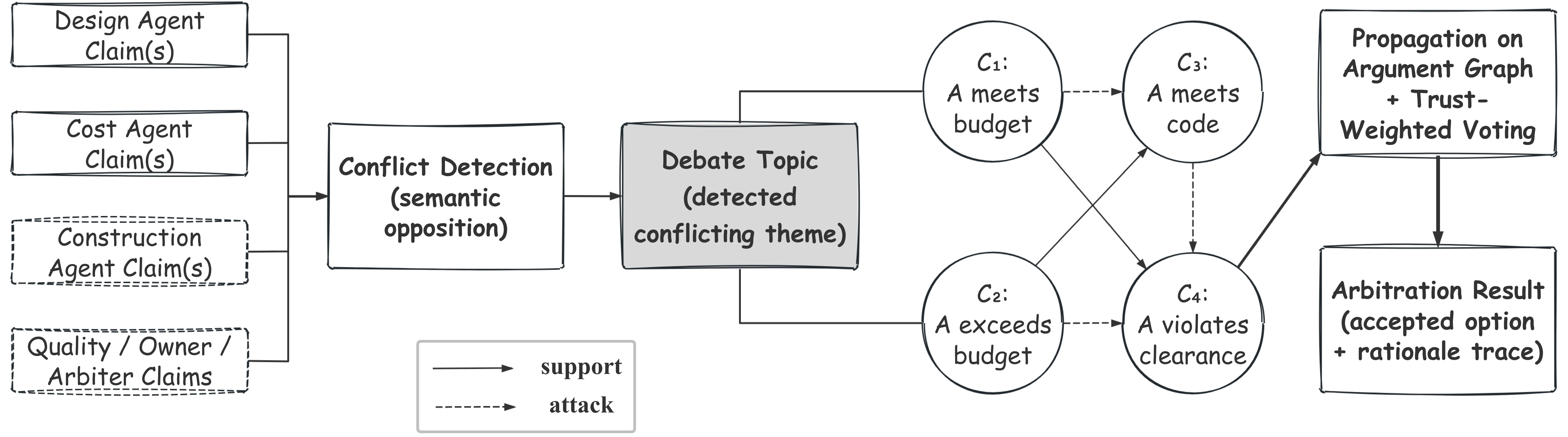 Agents present arguments in favor or against specific proposals, attaching evidence packages as justification[19]. Arguments are represented as nodes in an argument graph, with edges denoting support or attack relations. The system evaluates these arguments using criteria such as logical consistency, evidence credibility, and alignment with project objectives. Agents may revise their arguments in subsequent rounds, either reinforcing their position with new evidence or conceding when counterarguments prove stronger, as shown in Figure 2.