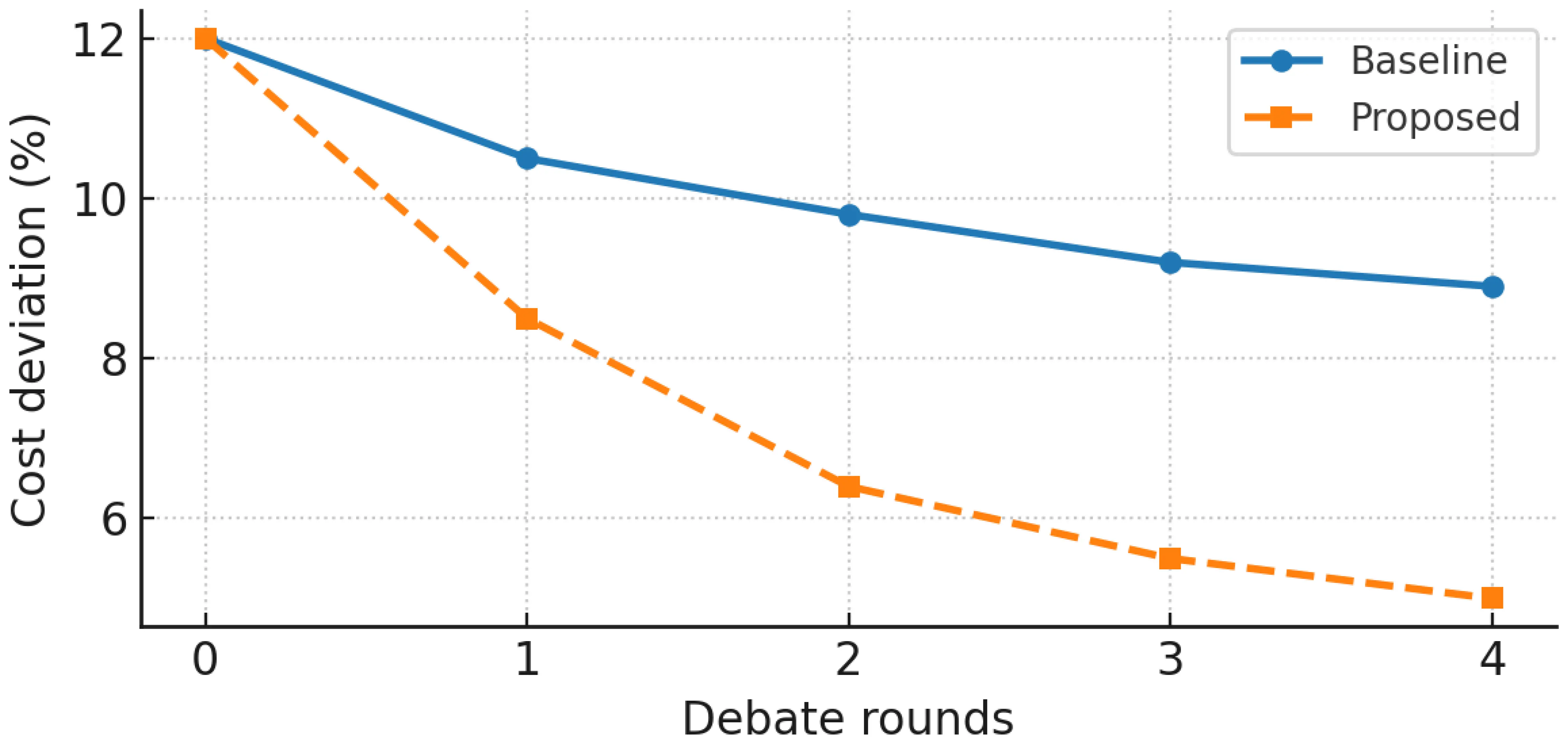 Learning mechanisms also ensure robustness. Agents are trained with perturbed data, such as fluctuating material prices or weather conditions, to build resilience to uncertainty[23]. Trust values are updated dynamically: agents that consistently provide accurate and useful arguments gain higher influence in future debates, while unreliable agents are down-weighted. This creates a self-correcting system in which expertise and credibility accumulate over time.