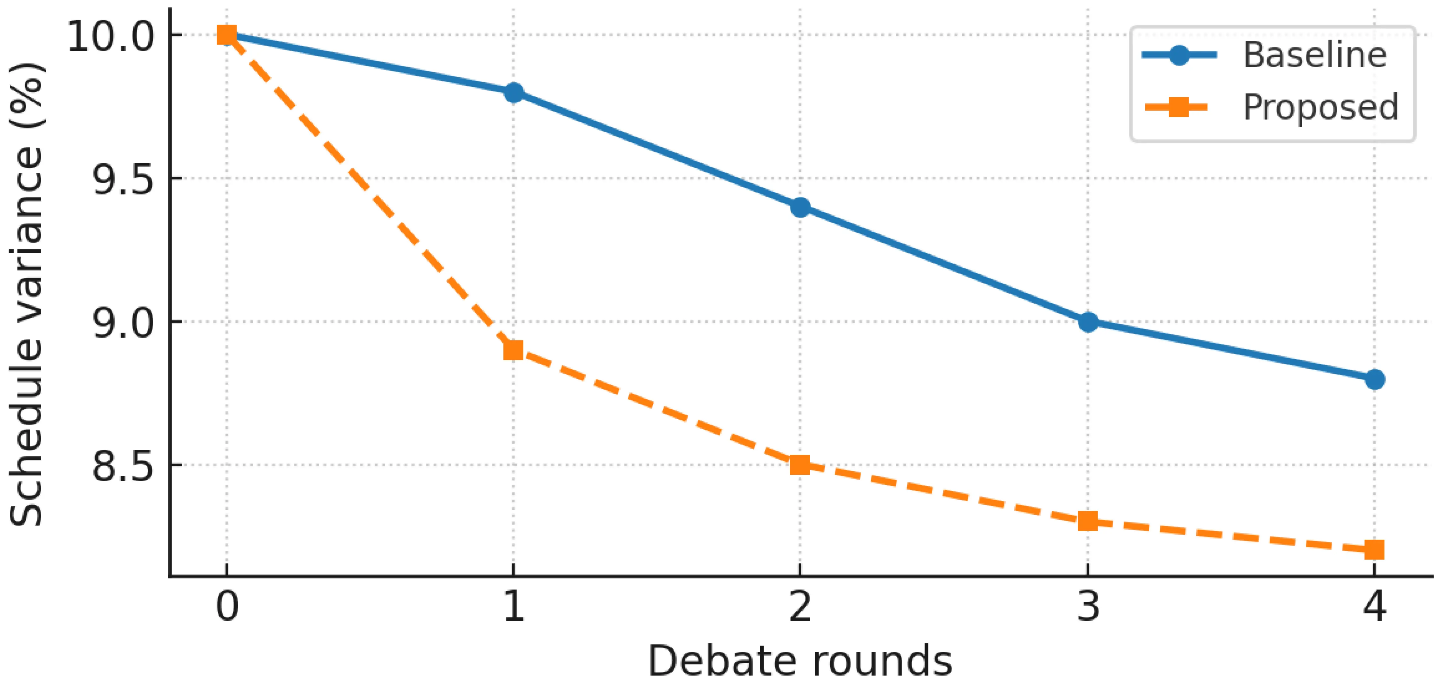 Agents receive feedback based on project outcomes—for example, whether a design change reduced CDev, or whether a scheduling decision improved on-time performance. Rewards are defined across multiple objectives: cost variance, schedule adherence, quality compliance, and debate efficiency (e.g., fewer rounds to reach consensus)[22].