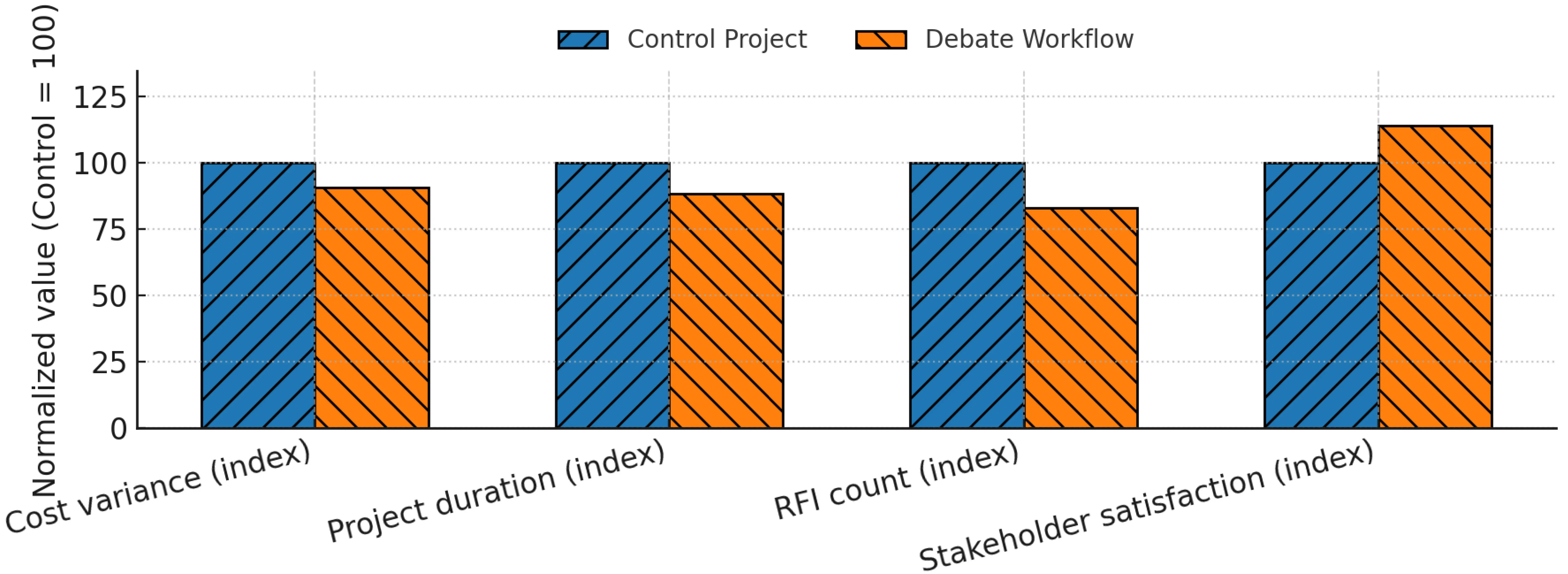 Figure 5. Case study comparison of key performance indicators. Values are normalized with the control project set to 100. The debate-oriented workflow reduces cost variance to 90.6, shortens project duration to 88.4, lowers the number of RFIs to 83.0, and increases stakeholder satisfaction to 114.0 relative to the control project. RFI: requests for information.