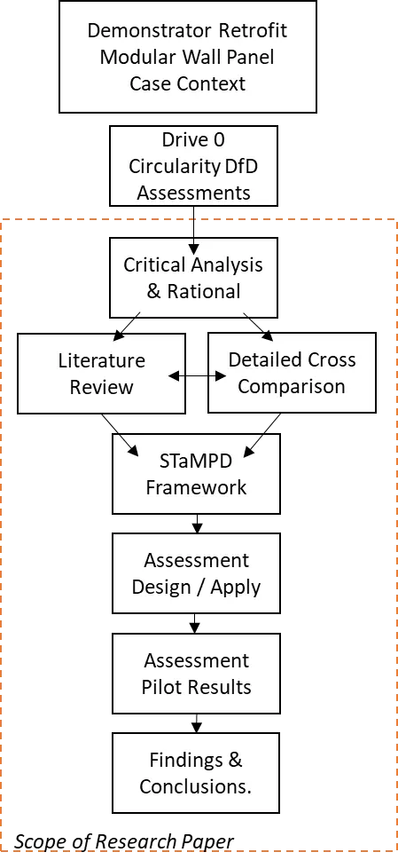 This paper firstly sets out the research approach and method, provides a contextual literature review, and reports on the Irish Drive 0 modular—circular wall system, with a critical review of the circularity, DfD assessment methods undertaken in the project—providing a rationale for a more holistic approach, which is based on a review and detailed comparative analysis of key relevant literature, providing the framework for development of a novel alternative DfD assessment entitled ‘STaMPD’, an acronym for Systems, Technical, Material, Process, Data. The novel method was piloted during prototype design of the Irish panelised wall system in comparison to a standard External Wall Insulation System (EWI) upgrade system, with critical discussions on results. This paper is focused on the rationale, design and pilot testing of the STaMPD DfD assessment method, with other aspects of design performance including structural, thermal, etc. subject of more holistic case studies and papers.