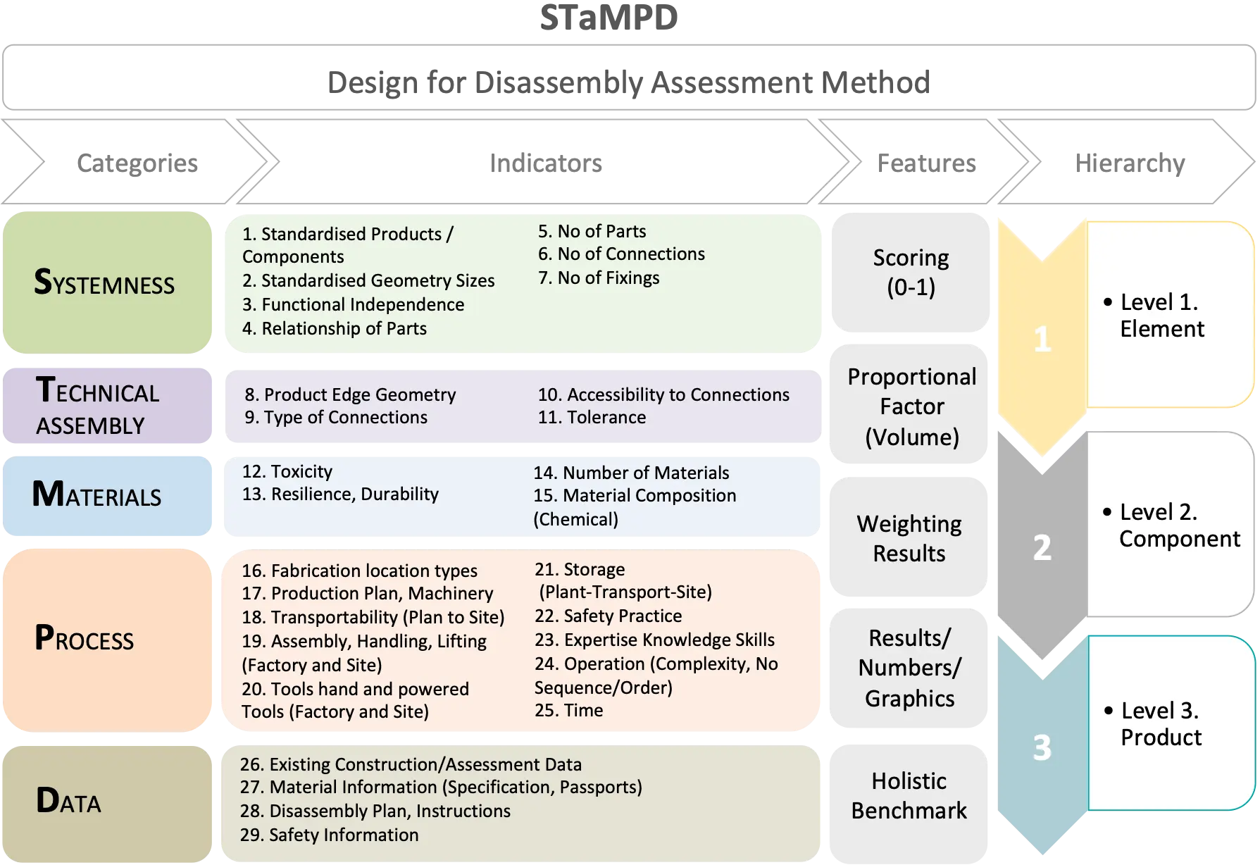 This research developed and piloted the STaMPD framework a holistic multi-level DfD assessment method, addressing limitations of the simplified Drive 0 approach, such as narrow scope, lack of hierarchy, single-scale scoring, limited weighting, and knowledge gaps in the literature. A detailed literature review and comparative analysis informed the framework, resulting in 29 harmonised indicators across five categories: three physical (Technical, System, Material) and two process-oriented (Process, Data).