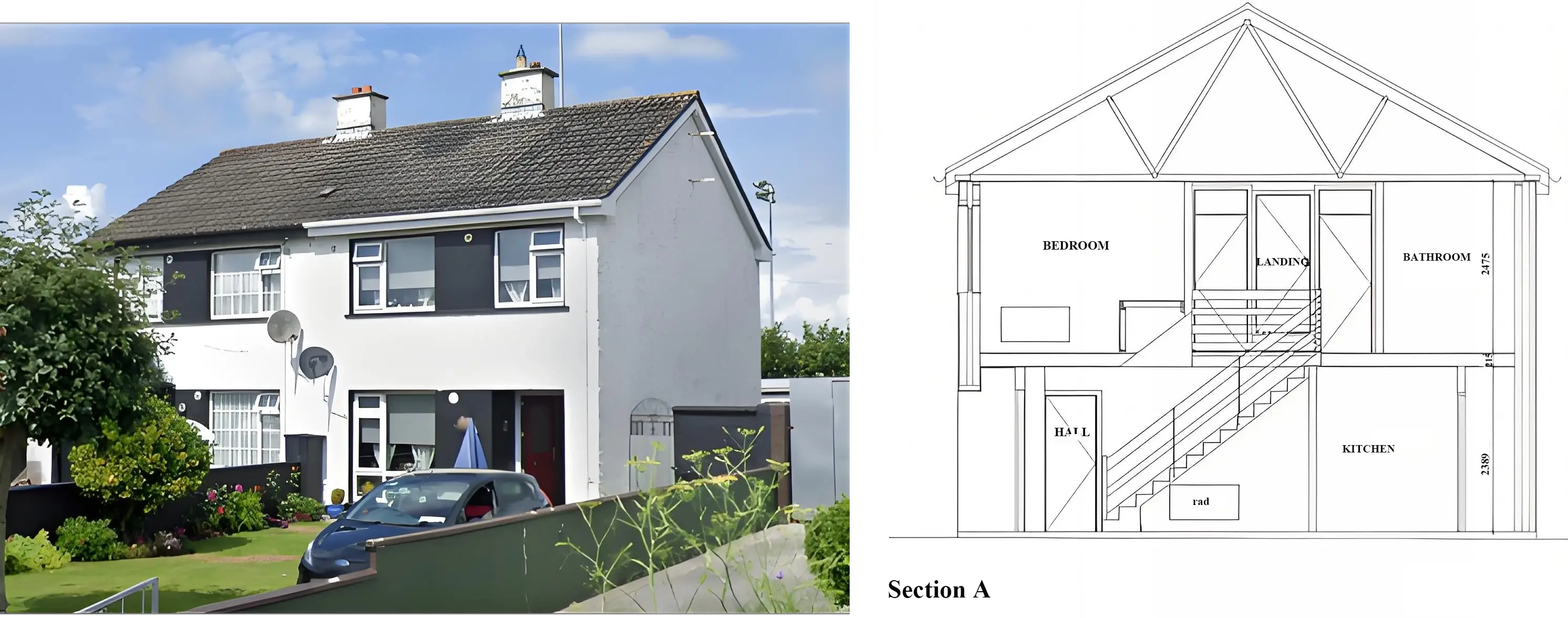 The Irish demonstrator retrofit targeted a significant 65% energy upgrade to two 1970’s social houses of masonry wall and timber roof construction, which had some previous retrofitting works undertaken. Figure 2 shows the Irish case dwellings photo of front elevation and cross section.