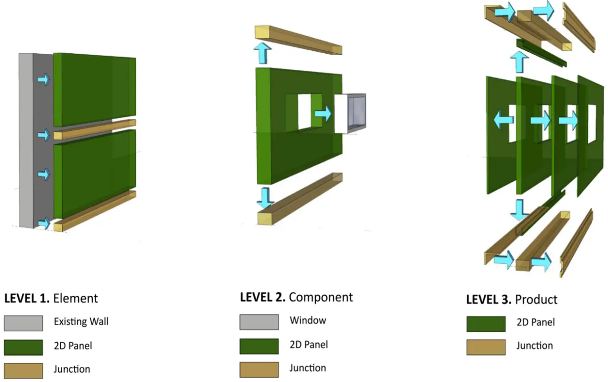 Figure 5. Schematic 3D of hierarchical levels for DfD and its assessment, for panel to host wall, key components and assembly of wall unit from products and materials[3]. DfD: Design for Disassembly.