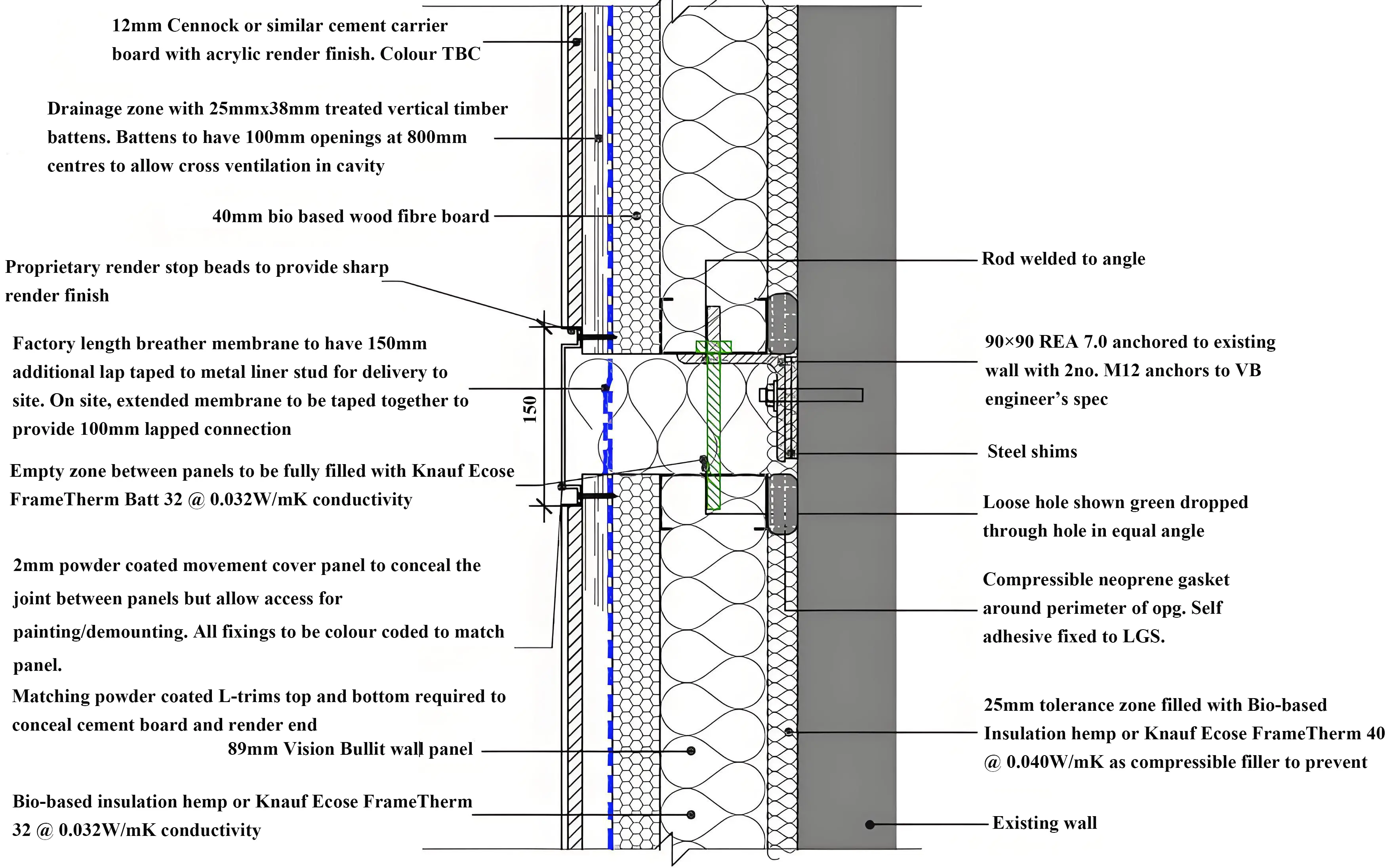 The proposed modular wall panel was to be based on the 89 mm LGS stud framing with a biobased quilt insulation between, with membrane to rear along with 25 mm compressible insulation with neoprene seals at edges, to reduce or eliminate thermal looping to rear of panel, and with wood fibre board to front along with breather membrane, batten, cement board and render finish to U Value of 0.18-0.2 Wm2k. Figure 4 shows the concept images of the proposed panel and its application in 2D wall over-cladding to front elevation and in a 3D extension pod.
