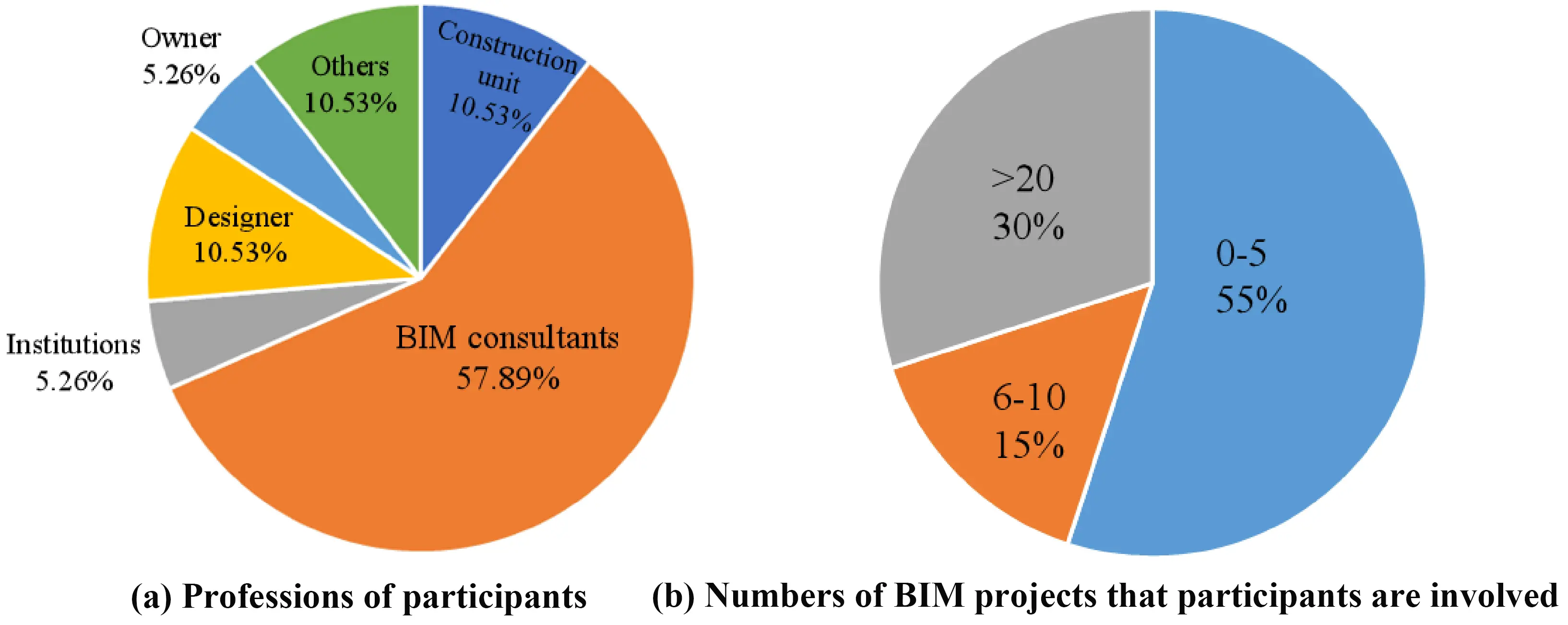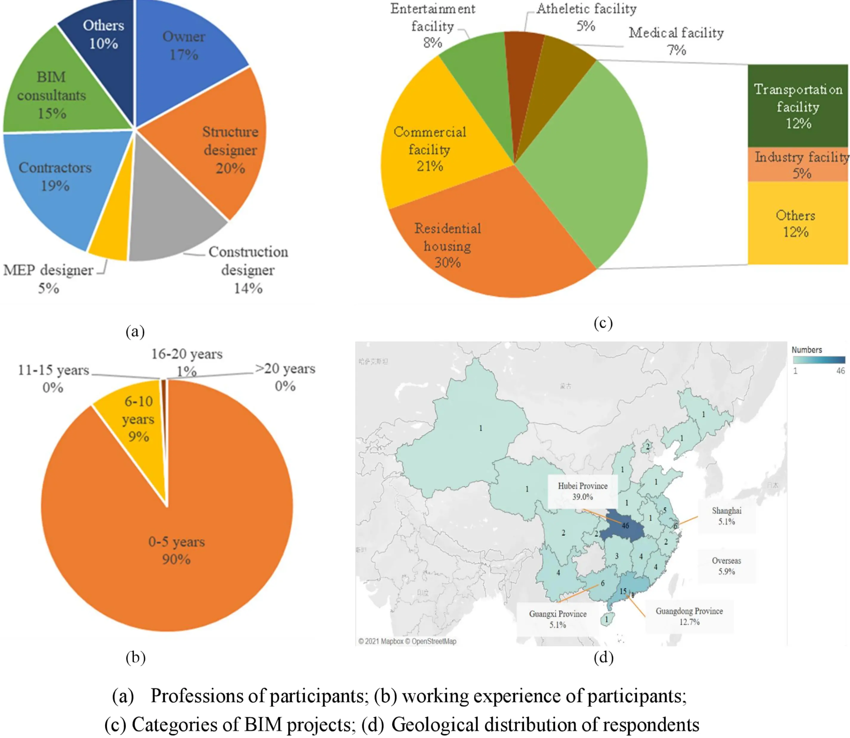 In addition, Table 2 summarizes BIM-related information about the respondents. First, BIM was widely applied to all kinds of projects, mainly in residential housing (30%) and commercial facilities (21%). Also, 82.2% of respondents reported that BIM projects had attained government funding. This evidence exactly reflects the present-day megatrend that politics is positively promoting the digital transformation in AEC industry. However, the strategic moves, especially in China, had insufficient influence on BIM adoption. As seen in Table 2, 54% of survey organizations own less than 5 BIM staff, and 66.1% of respondents have participated in no more than five BIM projects, indicating that BIM practices in China are likely to be stagnated and vulnerable to face the industry transformation by digital technologies.