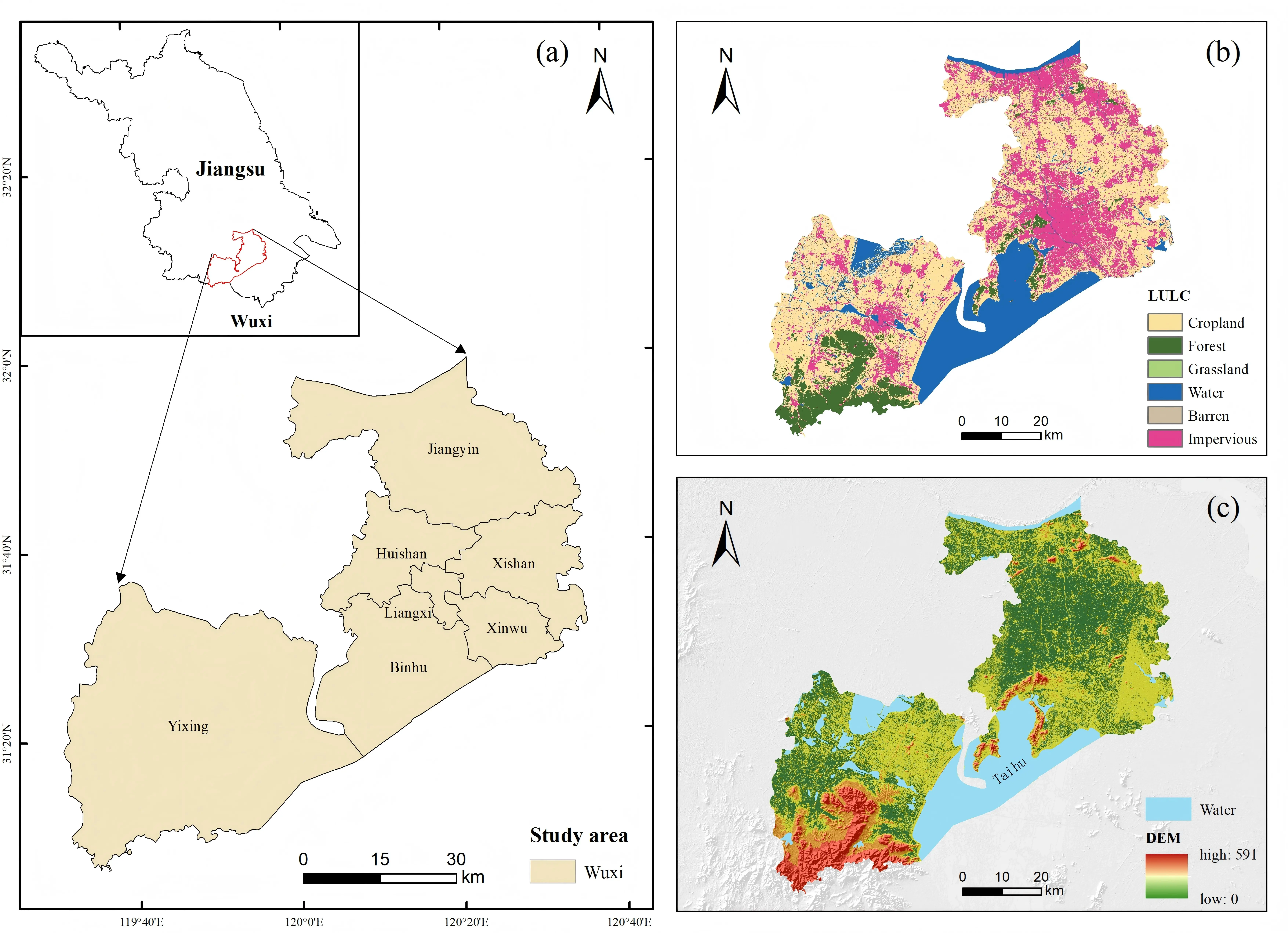 Figure 1. (a) Geographical location of the study area; (b) Land use classification; (c) Topographic features.