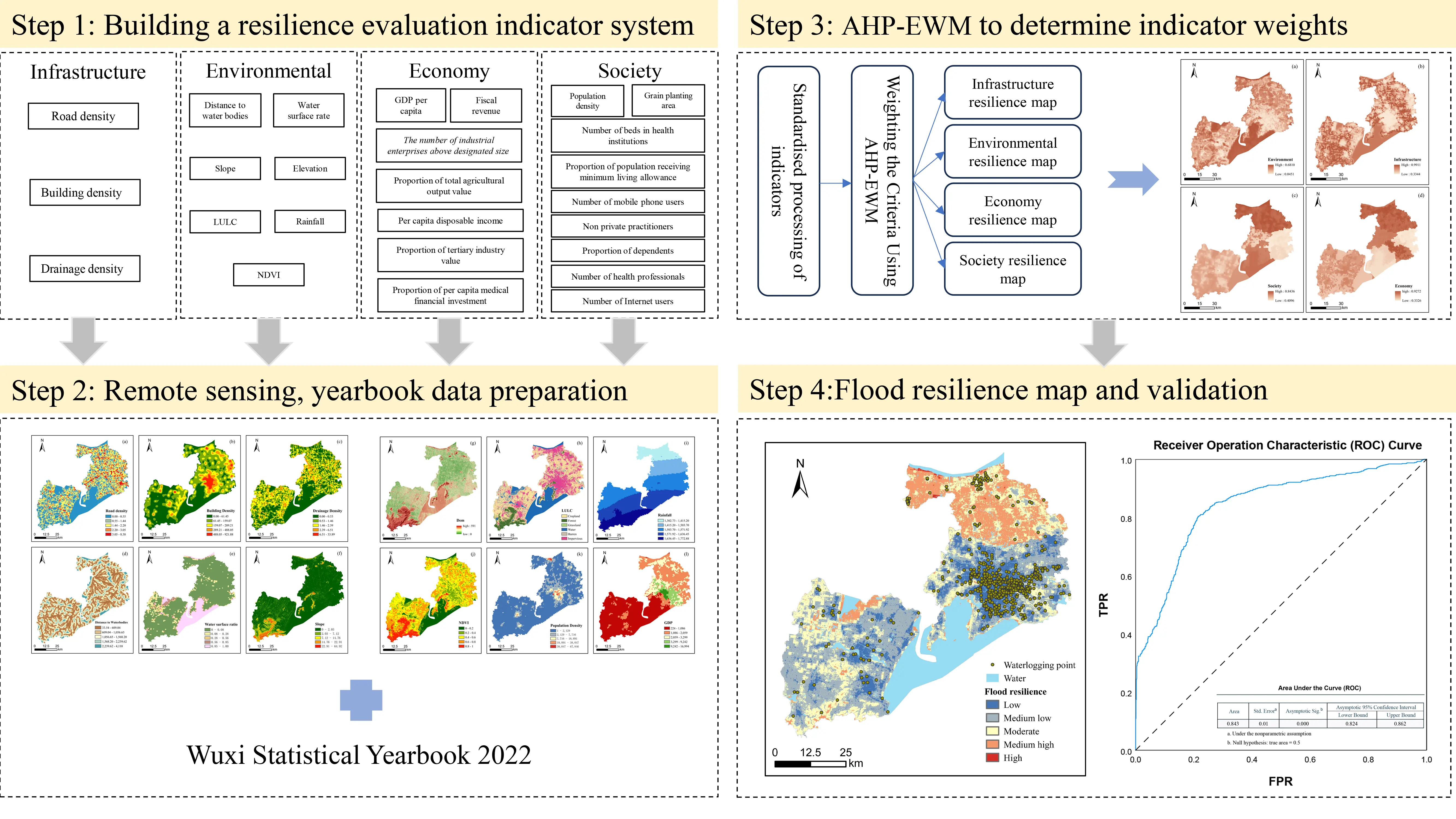 The objectives of this study are to: (1) propose a flood resilience assessment framework applicable to Wuxi based on the current research; (2) formulate a flood assessment index system for Wuxi, quantify the indexes using multi-source data, and quantitatively assess the flood resilience by using an assignment method combining hierarchical analysis and entropy weighting; (3) analyze the distributional characteristics of the urban flood resilience of the study area and verify the accuracy of the assessment framework by using the flooding event Area Under the Curve (AUC) curve; (4) make specific recommendations for flood disaster management and urban planning in the study area based on the emergy method.
