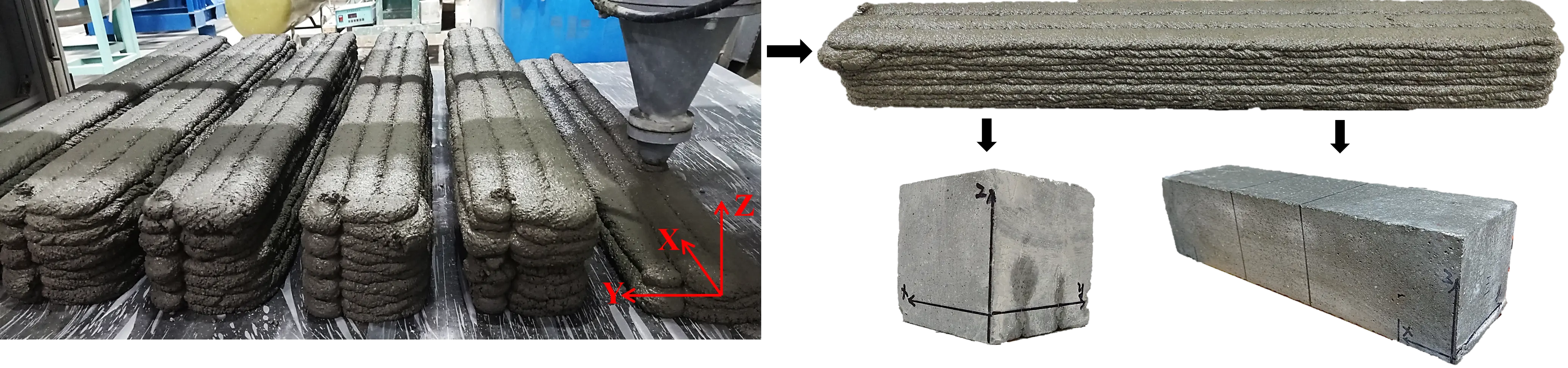 Preliminary trials have demonstrated that, with the employed 3D printing system, 3DPMSC exhibits optimal printability when the flowability falls within the range of 185-190 mm. Within this range, the material ensures smooth extrusion without blockage while maintaining sufficient shape retention under its own weight with minimal deformation. For the fabrication of mechanical test specimens, filaments with dimensions of 1,000 (length) ×120 (width) × (110-120) (height) mm were printed by stacking three layers. Subsequently, cubic specimens (100 × 100 × 100 mm) and prismatic specimens (100 × 100 × 400 mm) were saw-cut from the printed filaments. The cutting process was performed one day prior to the designated testing age to ensure dimensional precision.