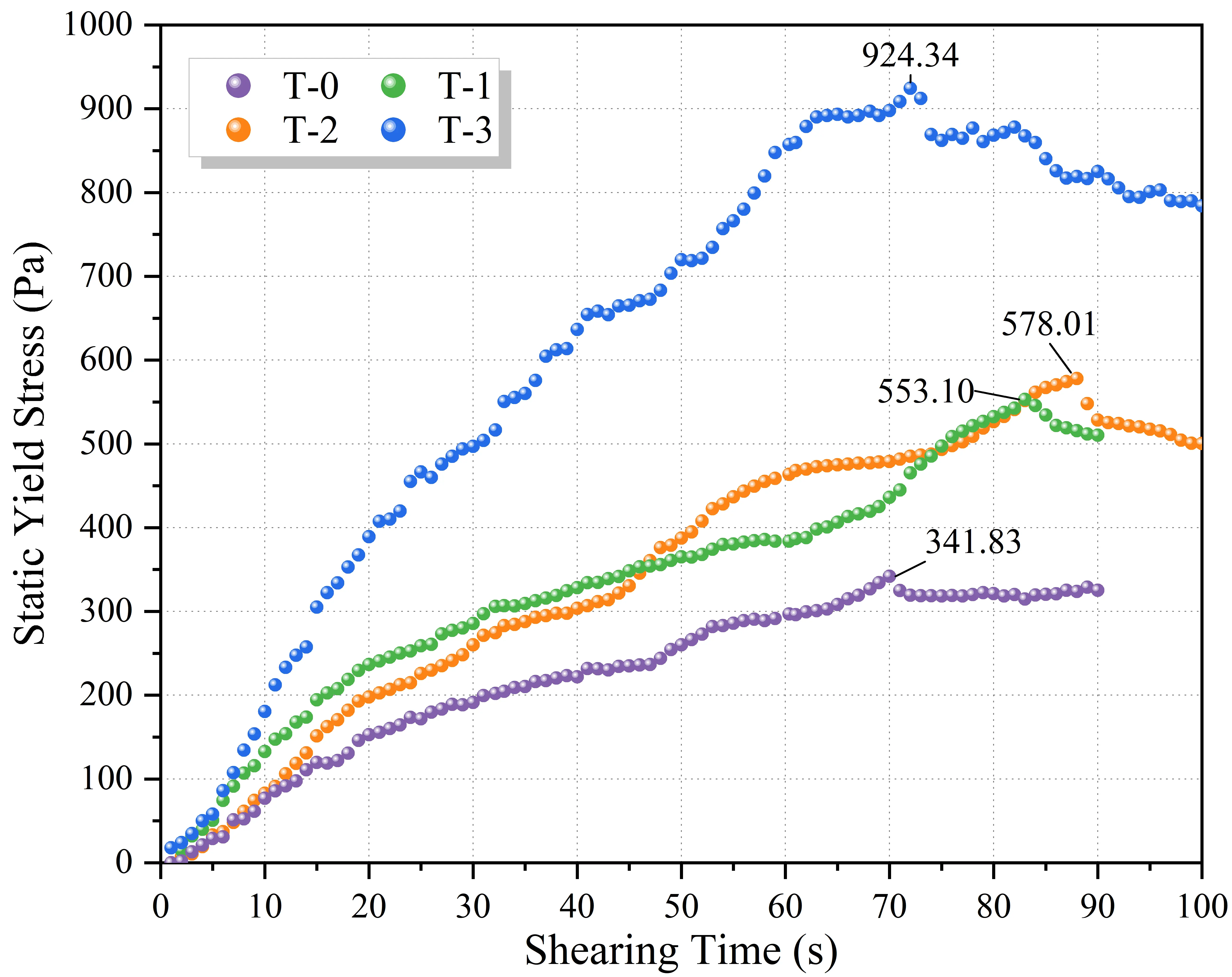 Figure 11 illustrates the time-dependent evolution of shear stress under a constant low shear rate, where the peak value represents the static yield stress. A distinct positive correlation was observed between MS content and static yield stress. The reference group, T-0, exhibited the lowest yield stress of 341.83 Pa. As the MS replacement level increased, the peak stress rose significantly, with the T-3 group ultimately reaching 924.34 Pa, approximately 2.7 times that of the T-0 group. This substantial enhancement is attributed to the mechanical interlocking effect of the angular tuff sand particles. Unlike river sand, the irregular shapes and rough surfaces of MS particles increase the internal friction angle, forming a rigid granular skeleton that resists the onset of flow. From the perspective of printability, the high static yield stress of T-3 is highly favorable for supporting the self-weight of deposited layers and preventing plastic collapse immediately after extrusion.