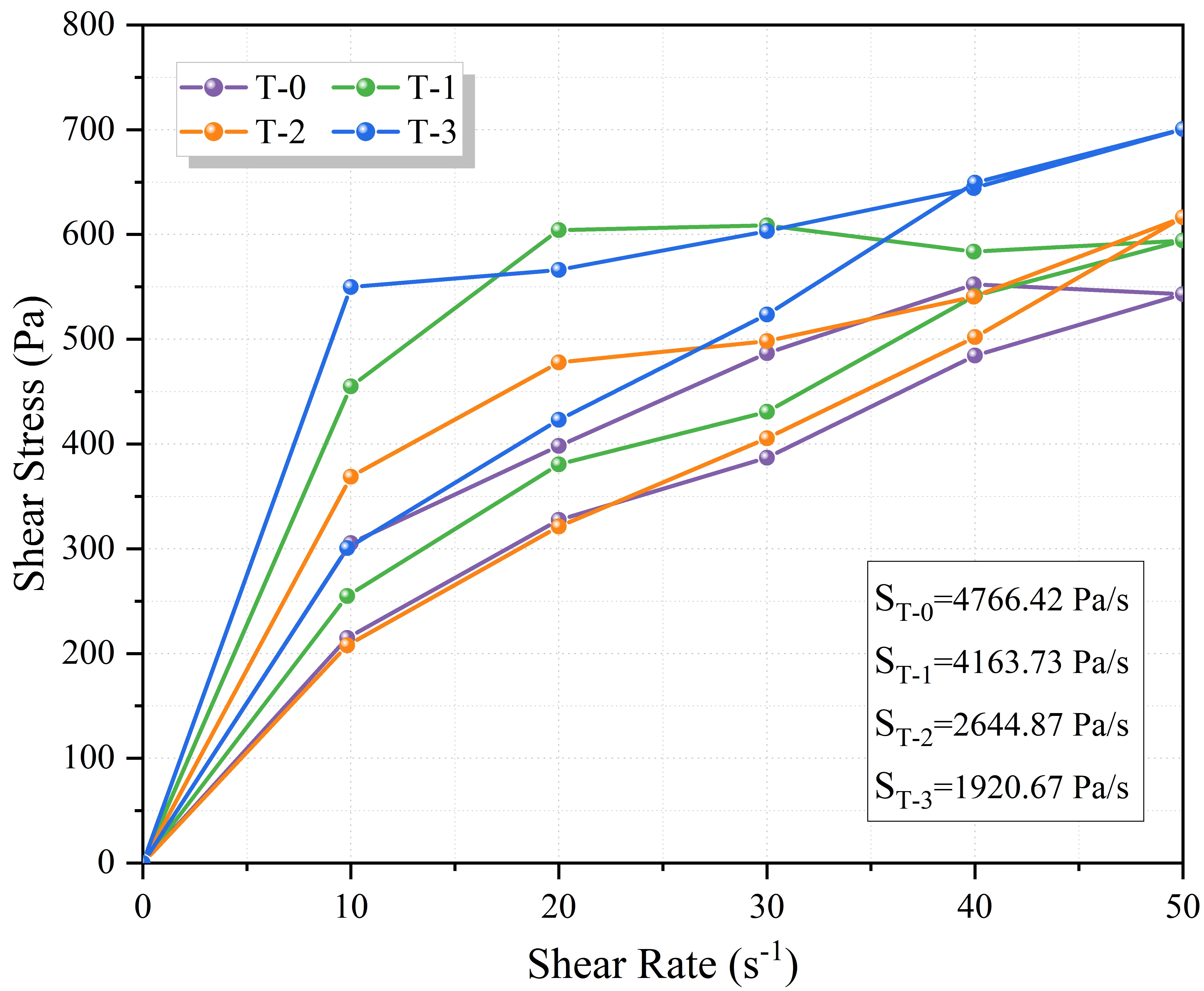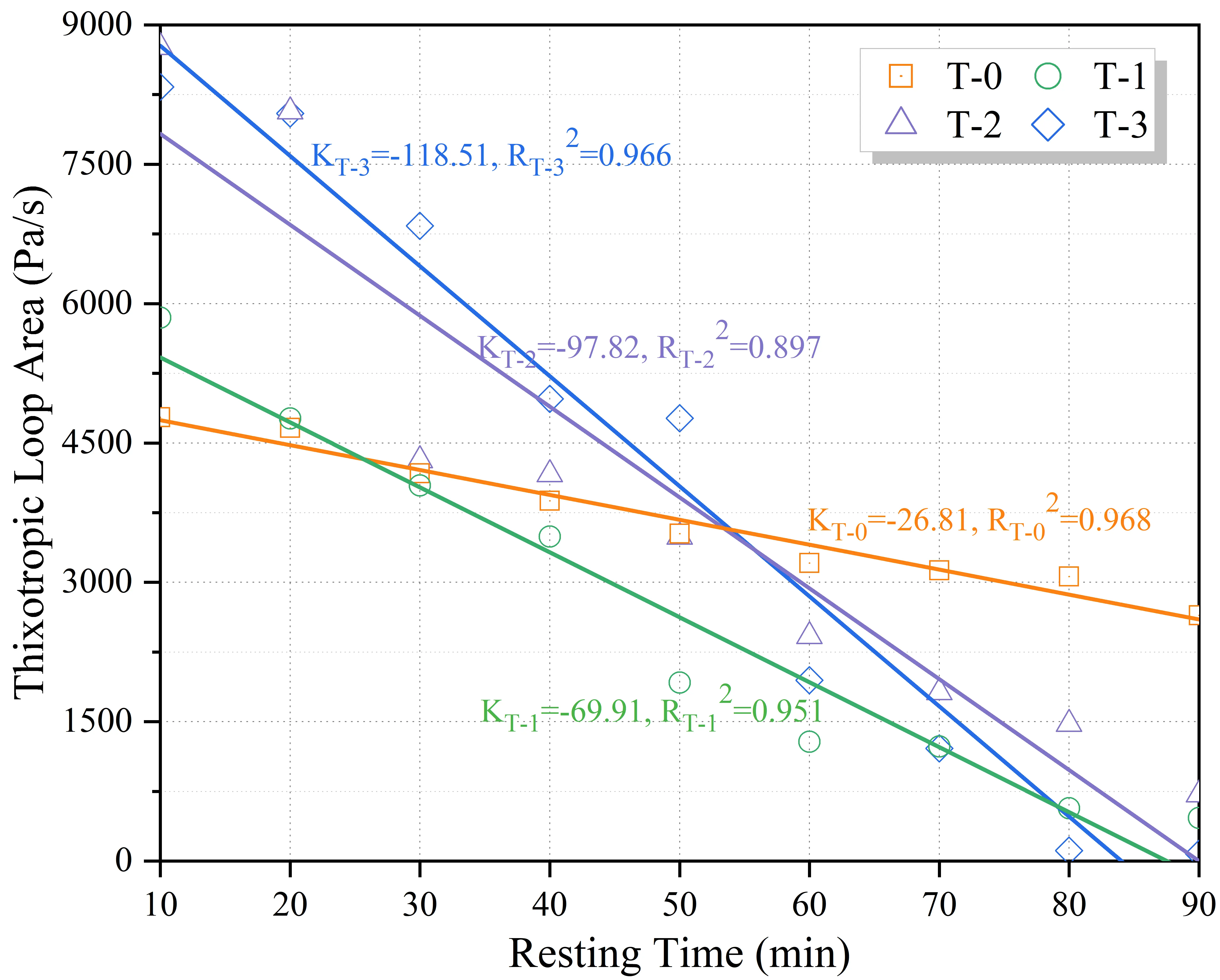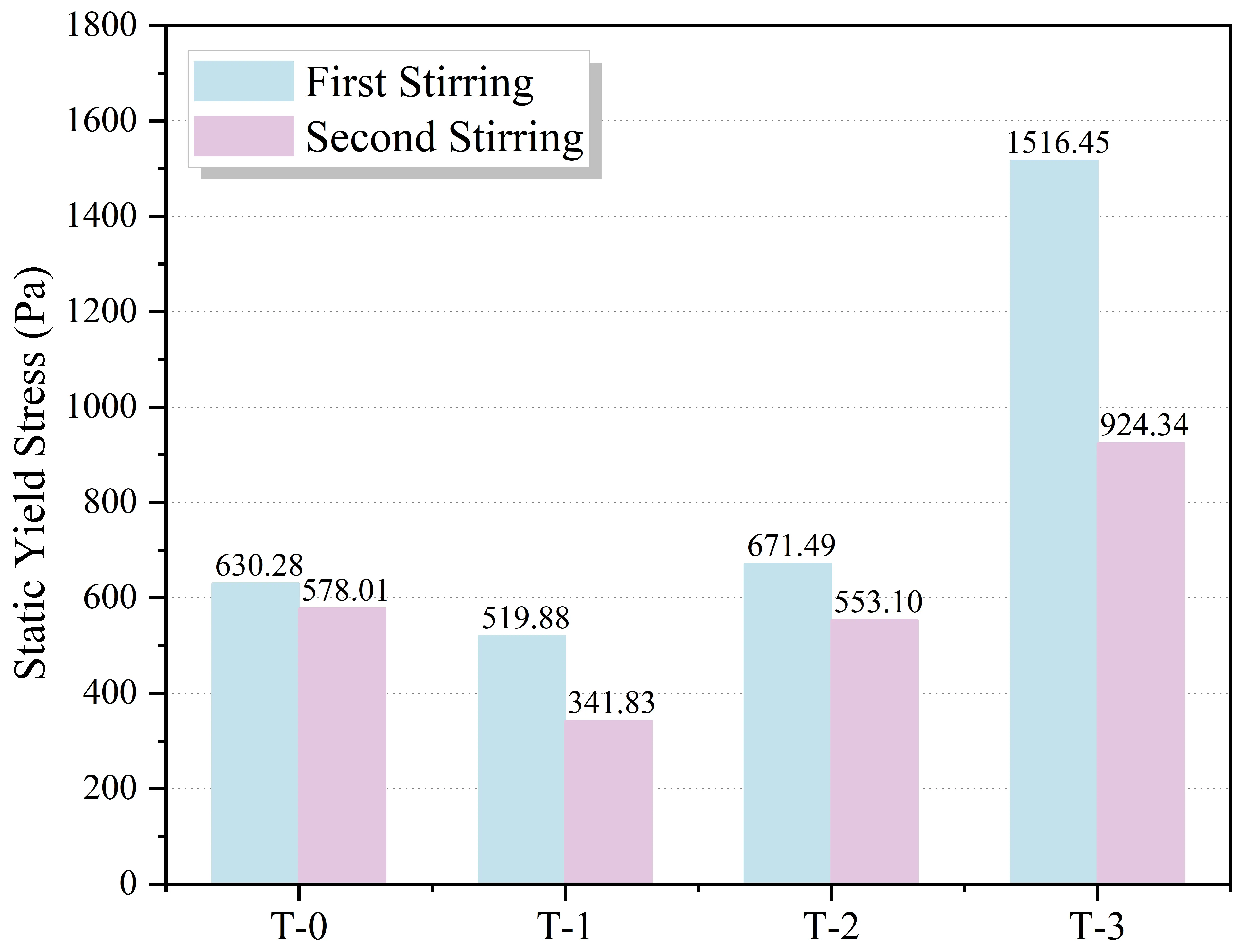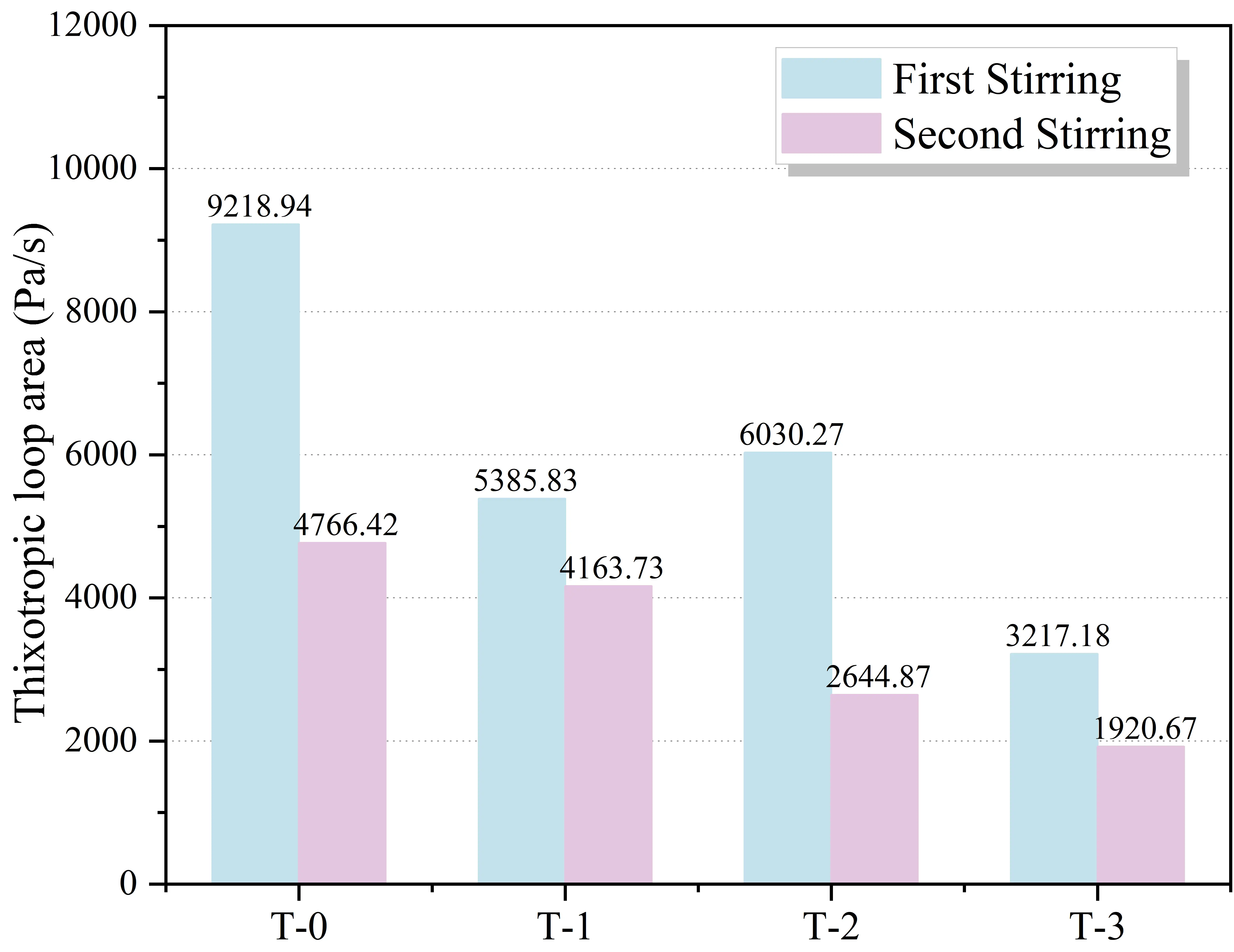 The thixotropic loop area, representing the energy dissipated to break down the internal microstructure, is presented in Figure 15. In alignment with the yield stress results, secondary mixing induced a significant contraction in the loop area for all groups. Specifically, the reference group T-0 decreased from 9,218.94 Pa/s to 4,766.42 Pa/s, while the T-3 group dropped from 3,217.18 Pa/s to