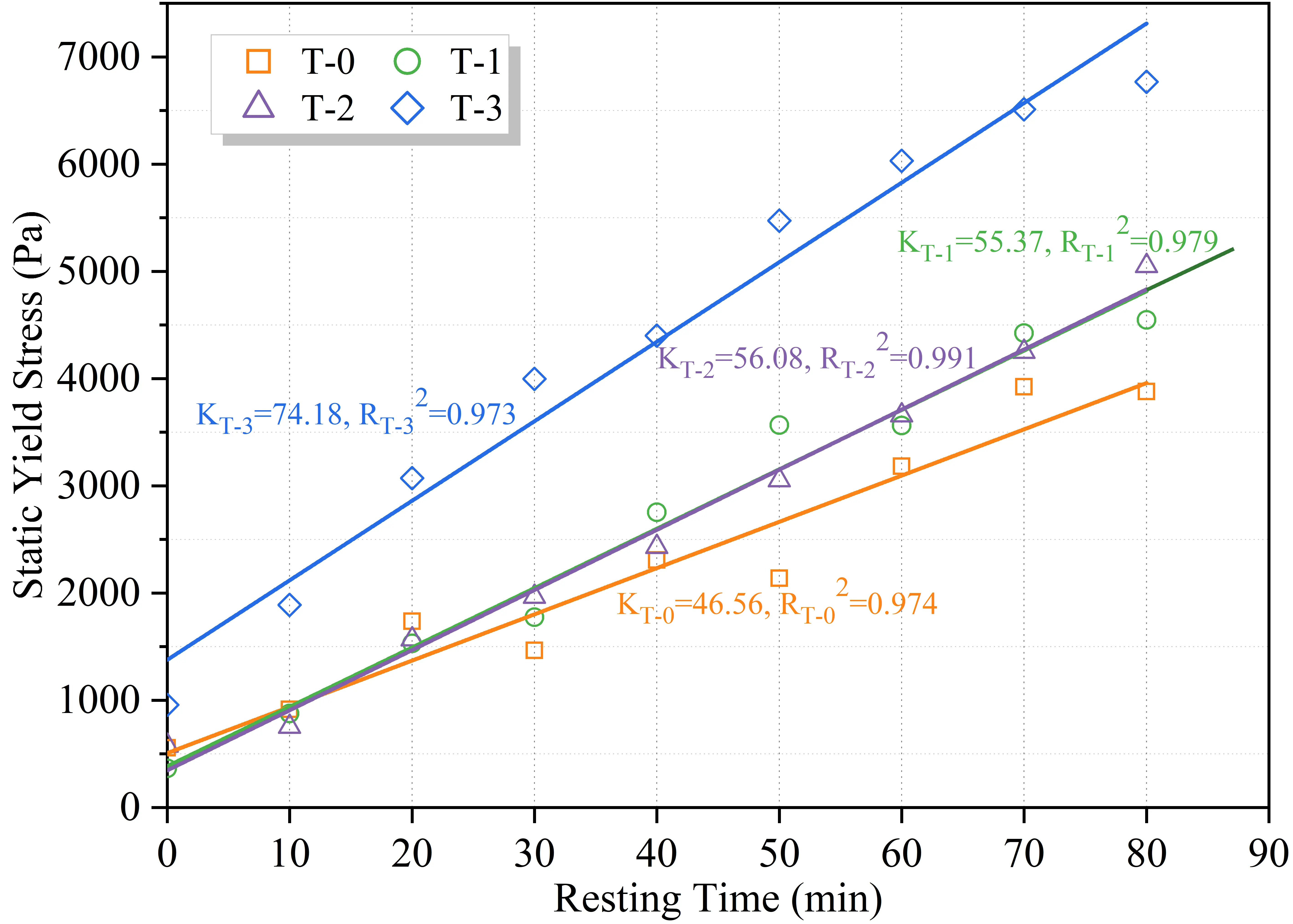 As illustrated in Figure 17, the thixotropic loop area of all groups decreased linearly with resting time, further confirming the strengthening of the internal microstructure. This phenomenon indicates a transition from a reversible thixotropic fluid to an irreversible rigid solid. With the extension of resting time, the consumption of free water and the formation of permanent C-S-H bridges diminish the material’s capacity to break down and flow under shear. This decay rate is pivotal for determining the open time of 3DPMSC. The T-3 group displayed the most rapid loss of thixotropy, characterized by a steep negative slope of KT-3 = -118.51. Notably, at 80 min, the loop area of T-3 approached zero, signaling a complete loss of extrudability. In contrast, the T-0 group maintained a slower decay rate (KT-0 = -26.81). This suggests that while the inclusion of MS enhances structural stability, it significantly narrows the effective printing window.
