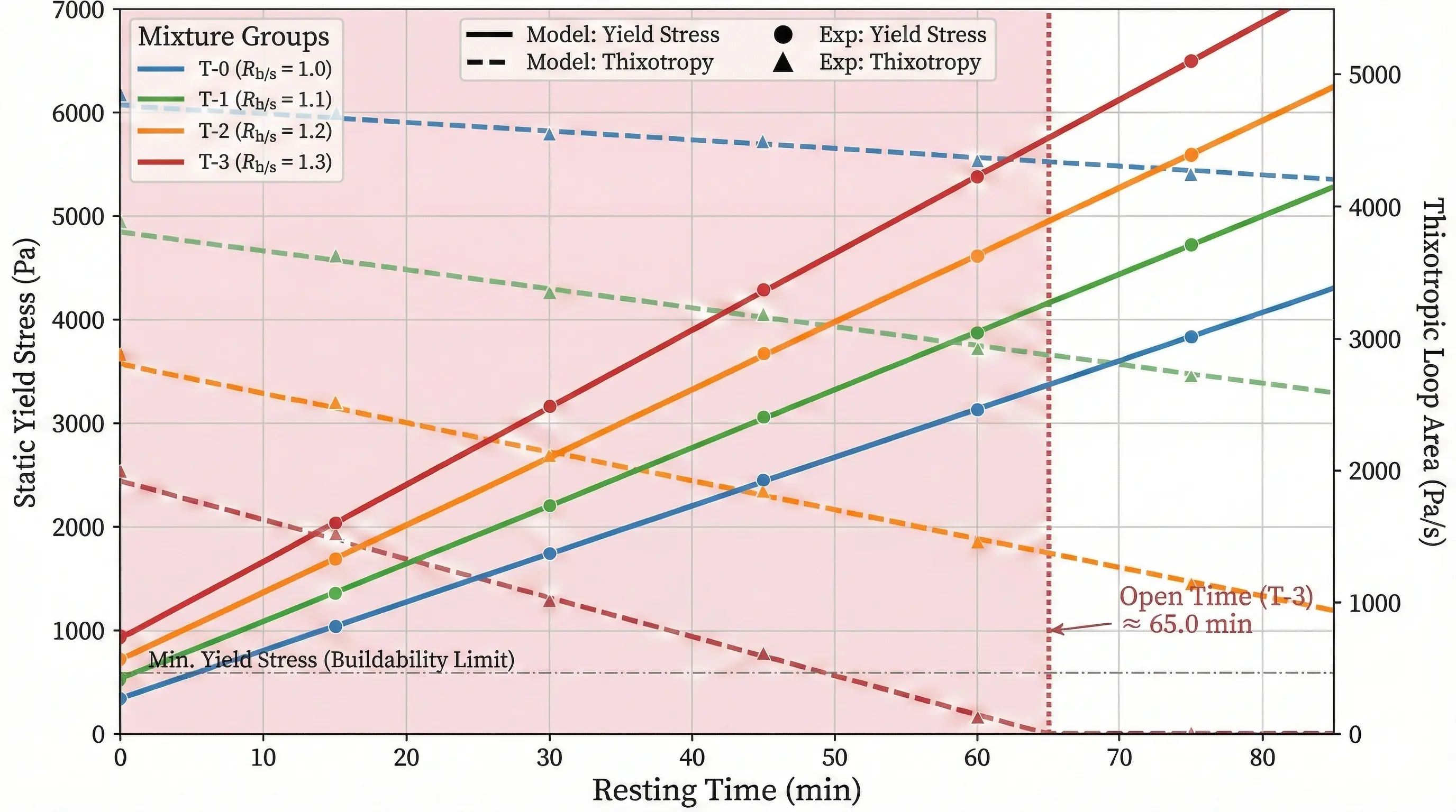 (2) The inclusion of MS linearly accelerates the Astruct due to increased nucleation sites and inter-particle friction. While the optimized T-3 mixture exhibits superior shape retention, its effective open time is restricted to approximately 60-70 min, necessitating optimized printing paths to avoid cold joints.