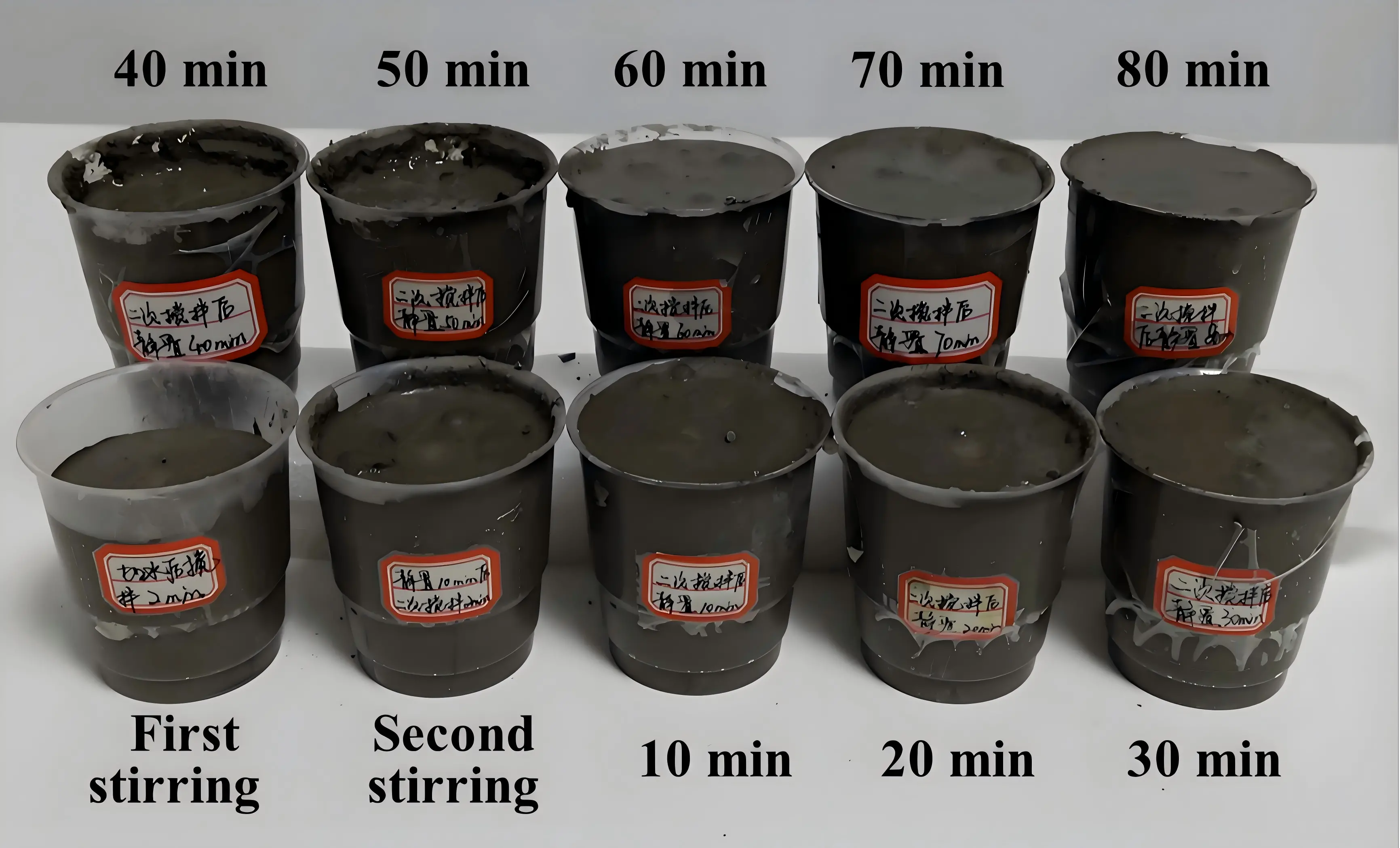 The mixture was allowed to rest in a controlled environment at 25 ± 1 °C for 10 minutes. This duration was strategically selected to align with the “dormant period” onset of the cement hydration kinetics. This stage is critical for allowing the paste to safely bypass the “acceleration period”[30] of cement hydration (specifically, the initial 15 minutes, when C3A reacts to form hexagonal