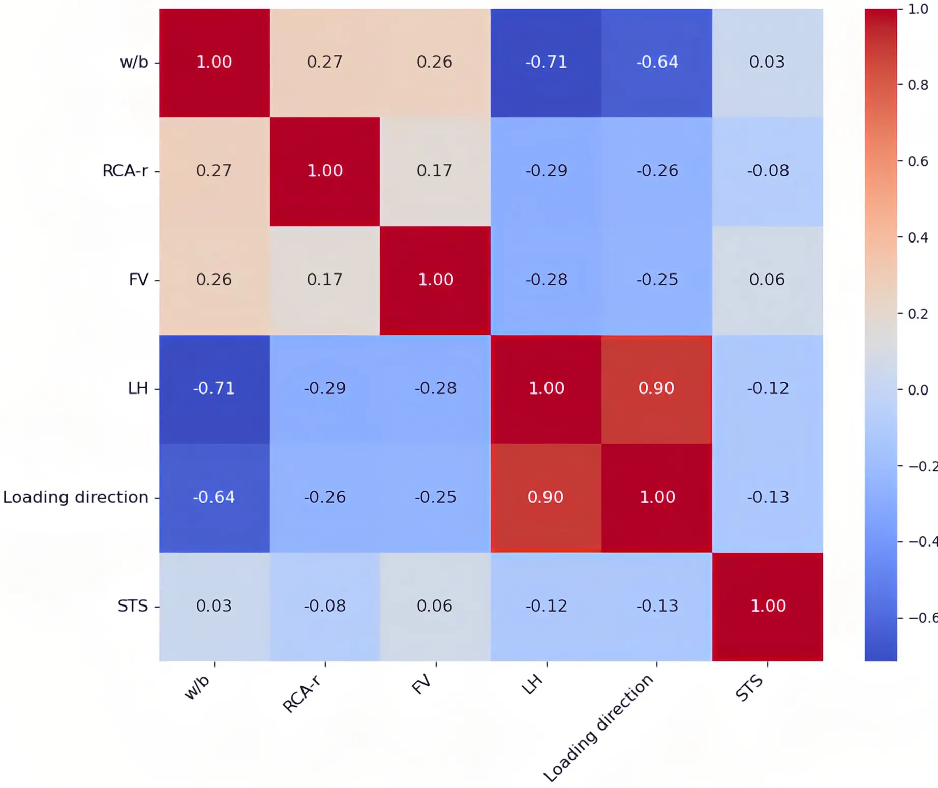 Figure 2. Correlation heatmap analysis of variables. FV: fiber volume; STS: splitting tensile strength; RCA-r: recycled aggregate replacement ratio; LH: layer height.