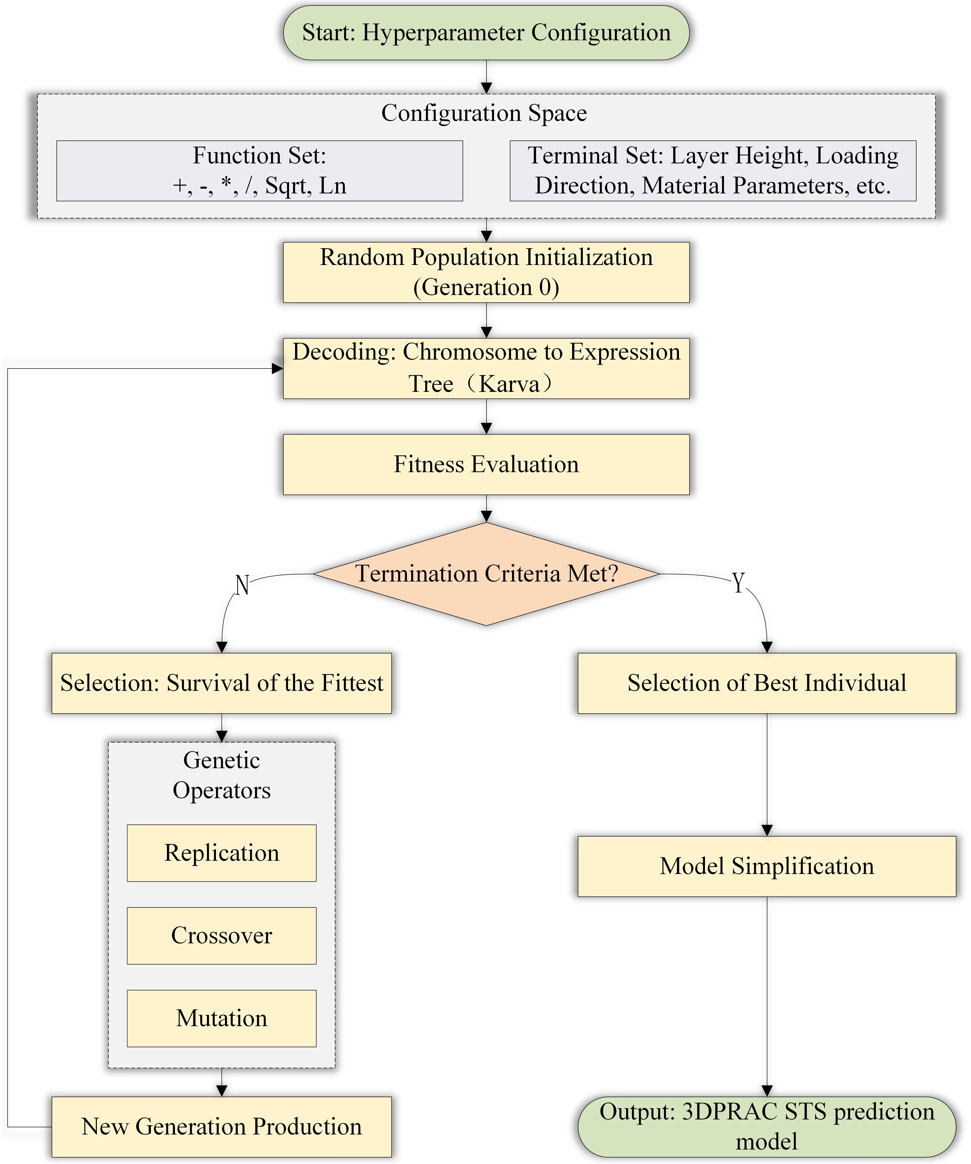 To address these challenges, this study develops a prediction model for the STS of 3DPRAC that integrates mixture proportions and printing process parameters. GEP is employed as the modeling technique due to its capability to automatically generate explicit mathematical expressions through symbolic regression, offering both transparency and direct applicability in engineering practice. The proposed model incorporates printing layer height and loading direction as key input variables, combined with feature engineering, to enhance interpretability and reveal the underlying mechanisms governing the mechanical behavior of 3DPRAC.