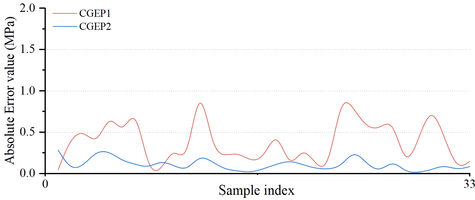 As shown in Table 4, while both models demonstrated reasonable fitting proficiency during training, performance discrepancies on the testing set reveal fundamental differences in generalization potential. The lower R² obtained for CGEP1 suggests limited predictive capacity for unseen data, while elevated RMSE and MAE values confirm significant deviations when processing new samples. By contrast, CGEP2 exhibits superior predictive fidelity. An R2 of 0.914 on the testing set indicates that this model captures over 91% of the variability in the target variable, achieving high concordance between predicted and actual values. Moreover, CGEP2 achieves significantly lower RMSE and MAE values than CGEP1. This improvement stems from the increased number of genes, extended head length, and the inclusion of non-linear operators (e.g., Sqrt), which enable CGEP2 to better capture the complex