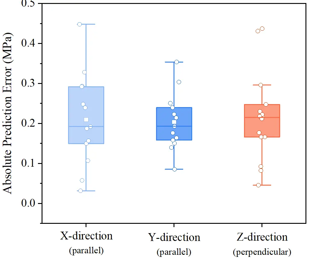 (3) In contrast, the Y-direction displays the most compact interquartile range and the narrowest error span. This indicates that the material exhibits the most stable mechanical response under lateral loading modes, resulting in the highest predictive confidence for the model.
