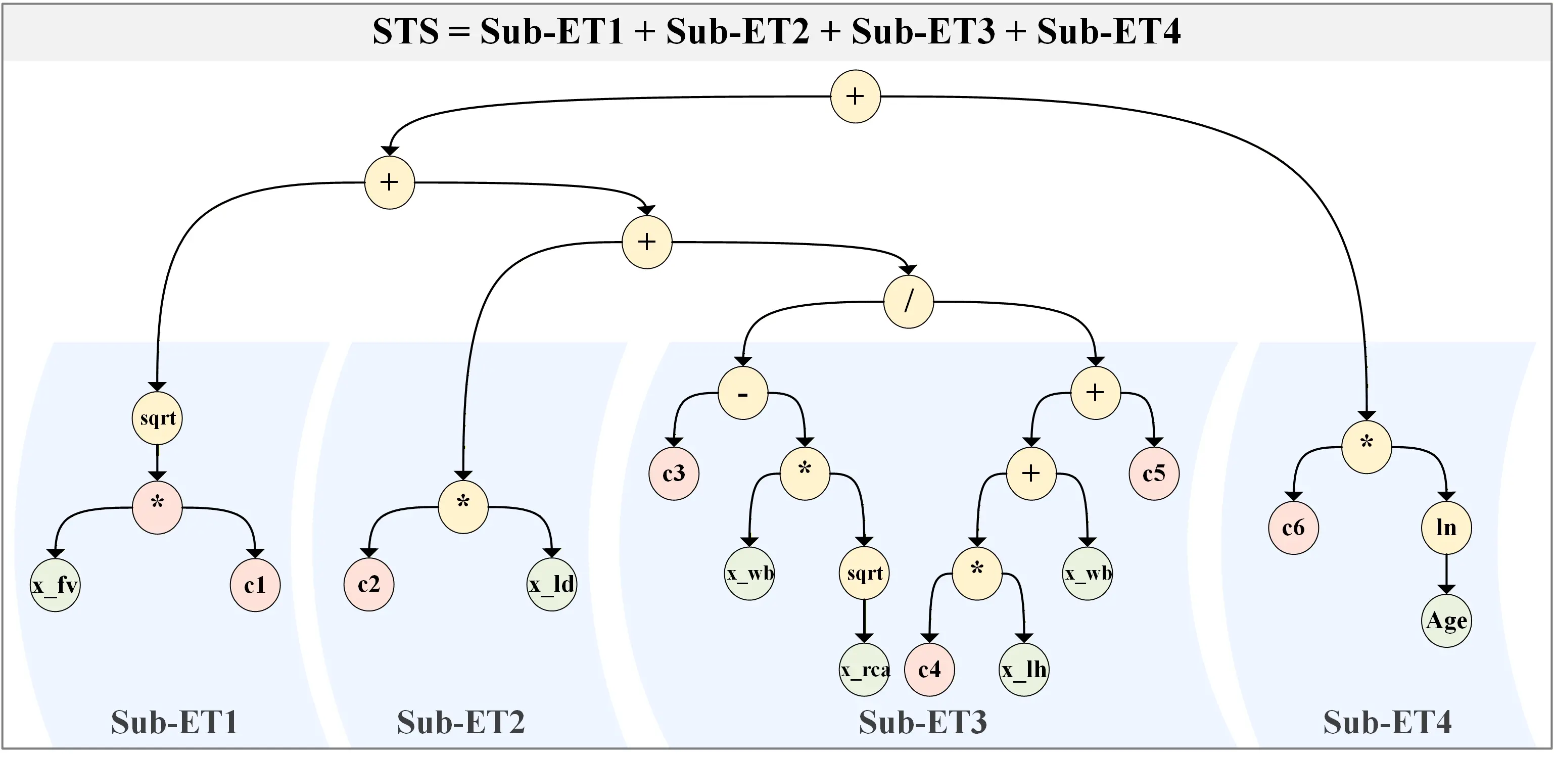 Each term in Eq. (7) corresponds to an independently evolving sub-tree structure that captures a specific physical mechanism, with the linear combination of all sub-trees constituting the complete predictive model.