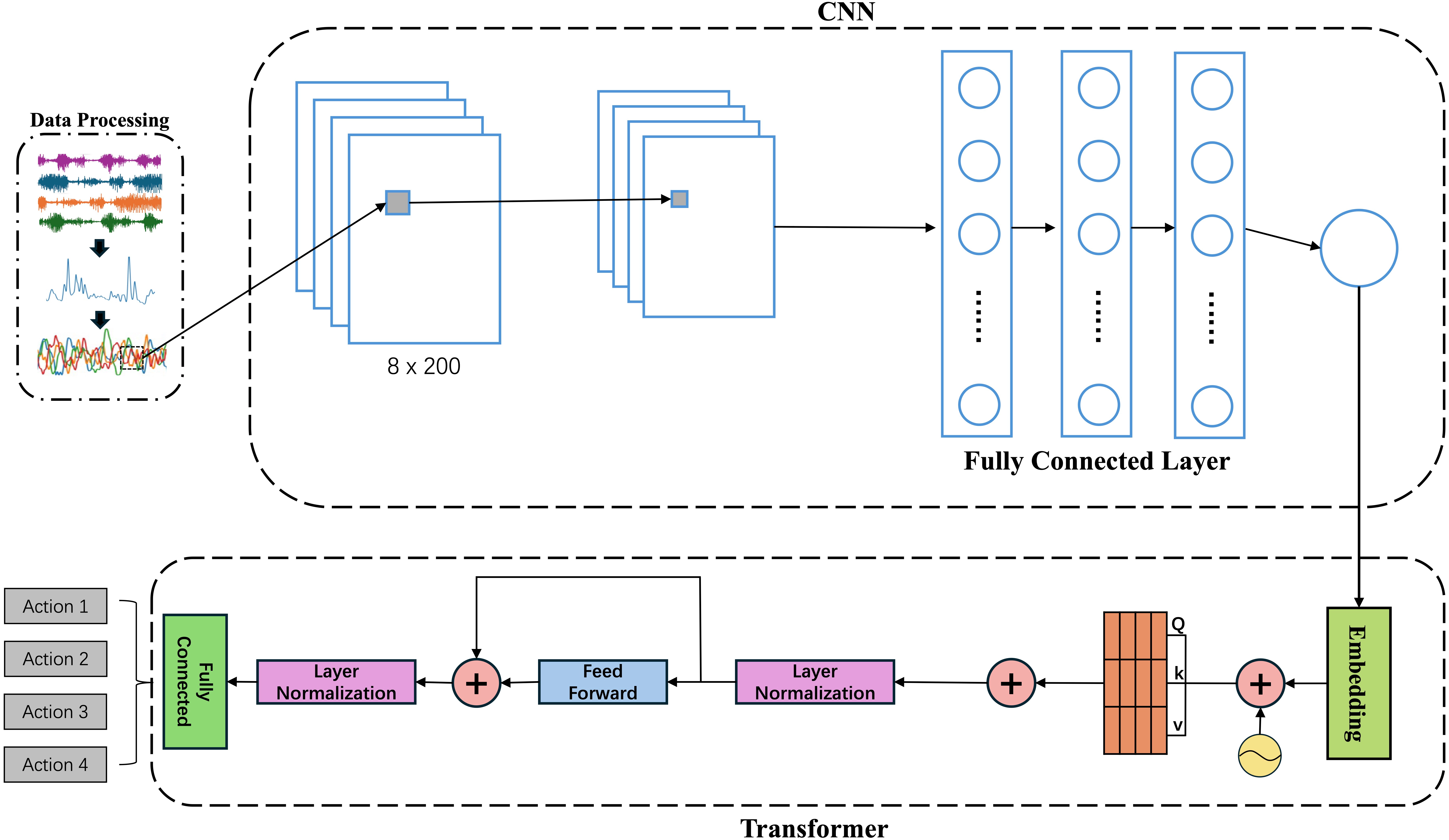 In summary, CNN addresses short-term, channel-level noise and alignment variability, while the transformer captures long-range dependencies and action context. This division of labor enhances cross-subject and cross-task generalizability under field conditions, in line with decomposition-first feature extraction and supervised classification practices reported in construction ergonomics.