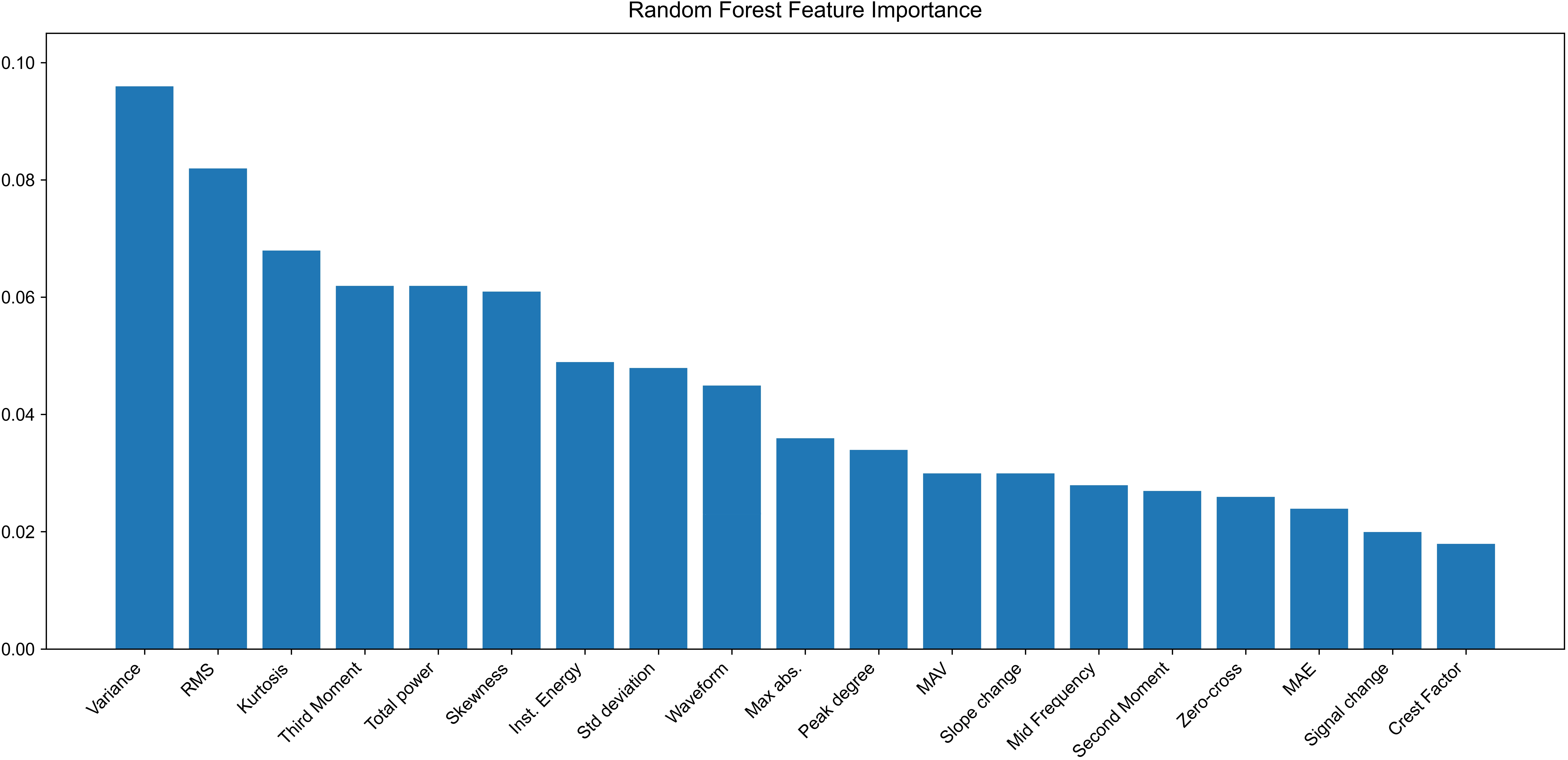 Figure 3. Random forest feature importance. RMS: root mean square; MAE: mean absolute error; MAV: mean absolute value.